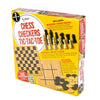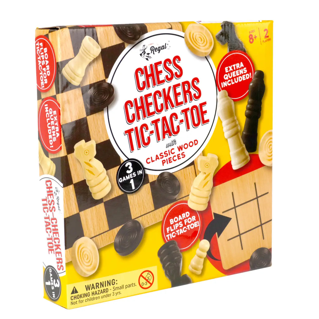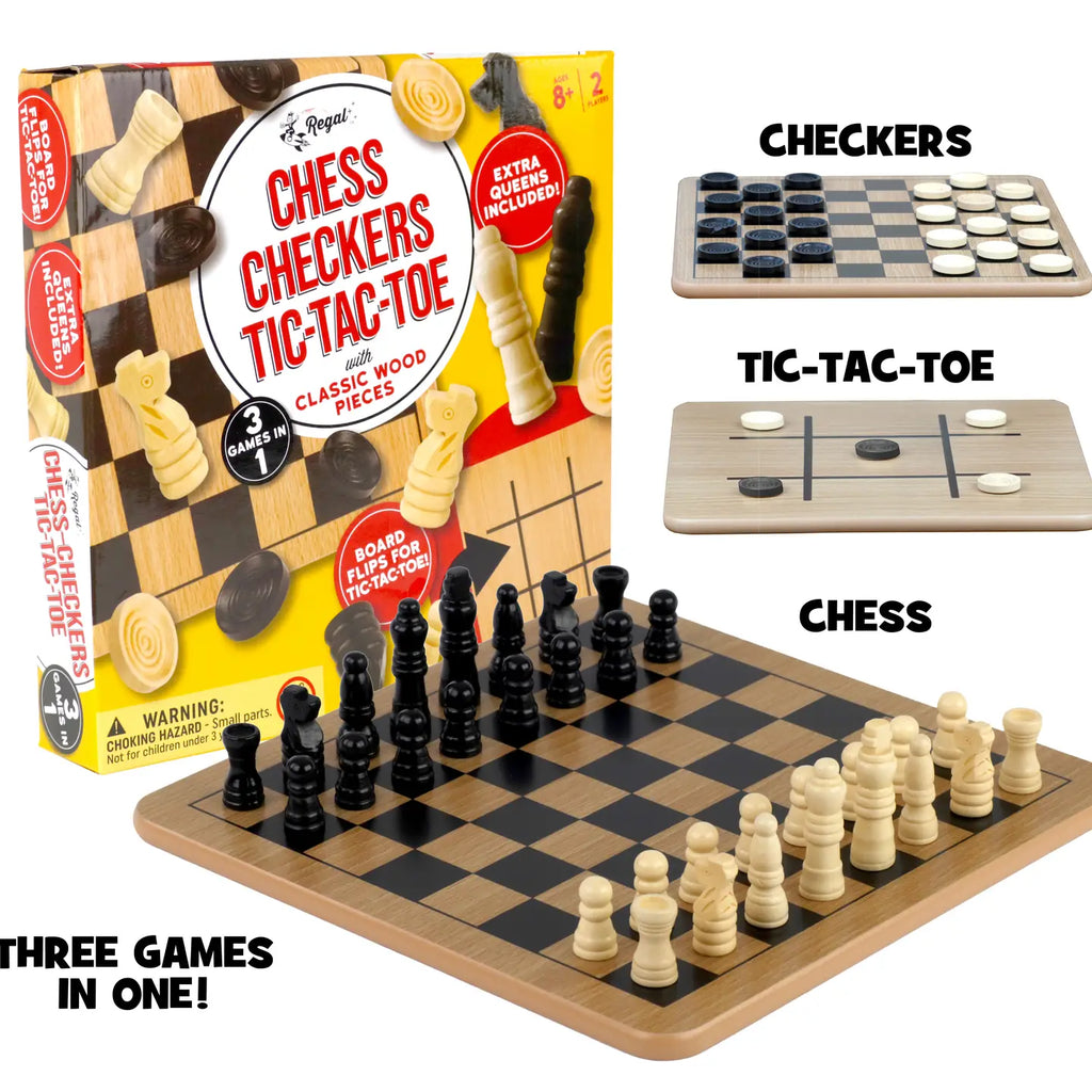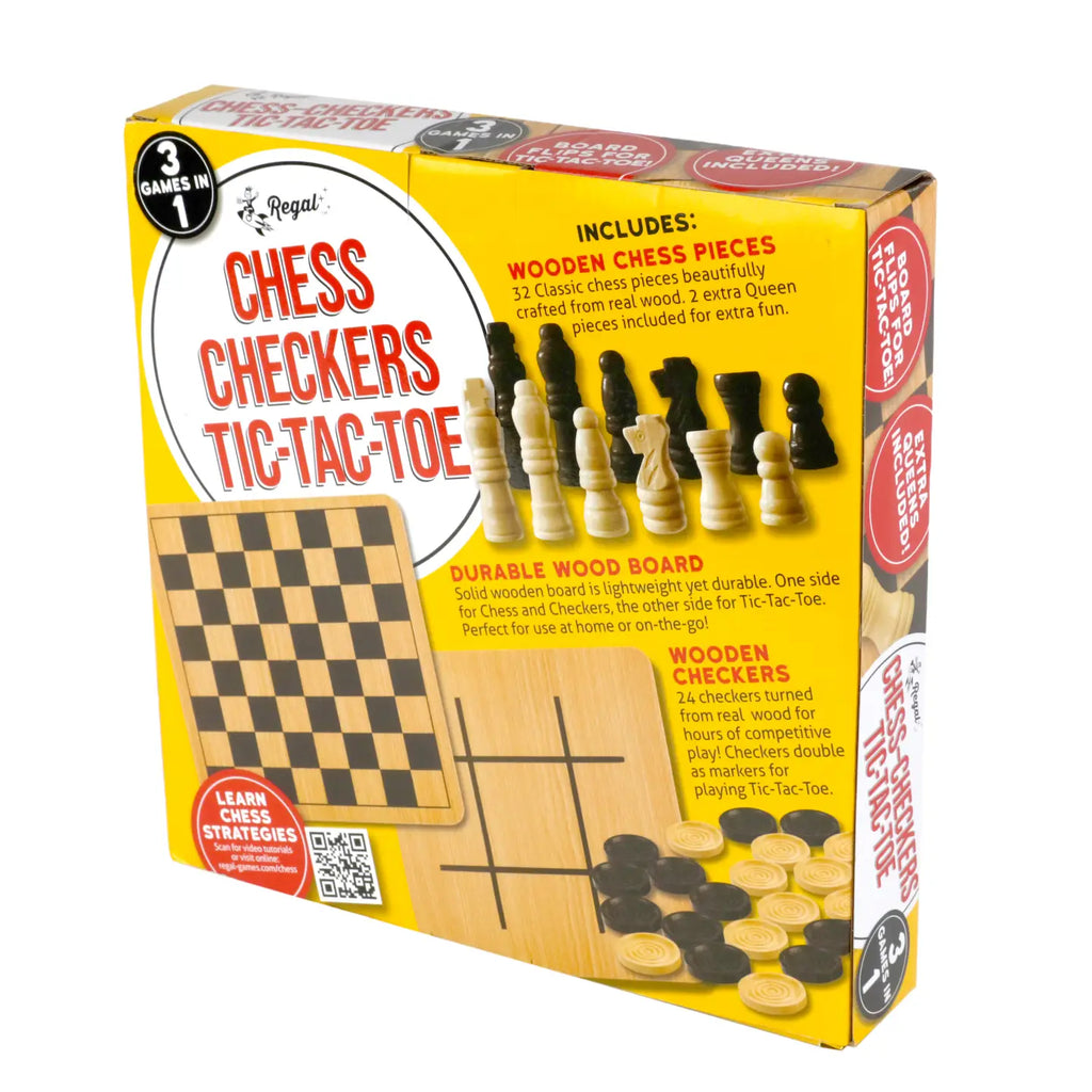 Comes with Wooden Checkers, Chess, and Tic-Tac-Toe Reversible Board Game comes with everything you need to have a good time with family and friends, including a 10.5 x 10.5" wooden board that can be used as a checkerboard, chessboard, or tic-tac-toe board. Includes 24 interlocking wooden checkers and 32 chess pieces.