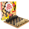 Reversible Wooden Board for Chess, Checkers & Tic-Tac-Toe! Board Game with 24 Interlocking Wooden Checkers and 32 Standard Chess Pieces.
