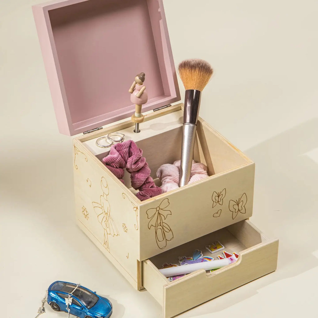 Our ballerina-inspired musical souvenir box is designed with ballet-related engravings and includes a little ballerina that pops up when you open it. It plays the soothing melody of "Swan Lake", perfect for capturing precious childhood moments or adding a touch of natural beauty to your space. This music box is a timeless keepsake that will enchant both young and old alike.
