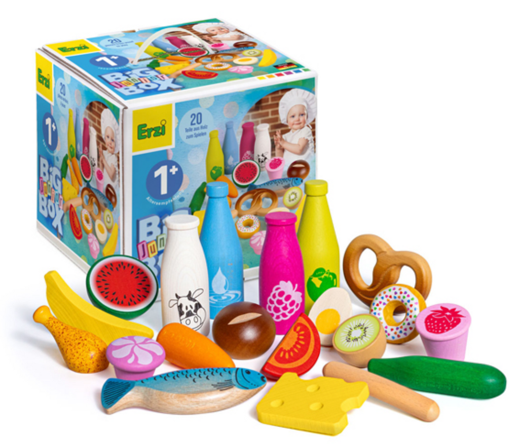 The Erzi Big Box Junior is a great introduction to the world of pretend play and an essential part of any play kitchen or shop. Children love to imitate what adults do, whether it is shopping, cooking, or sitting down to eat. The miniature food by Erzi will become an integral part of playtime, encouraging hours of house and shop fun. Great toys to stimulate young imaginations! Handcrafted in Germany of beechwood.