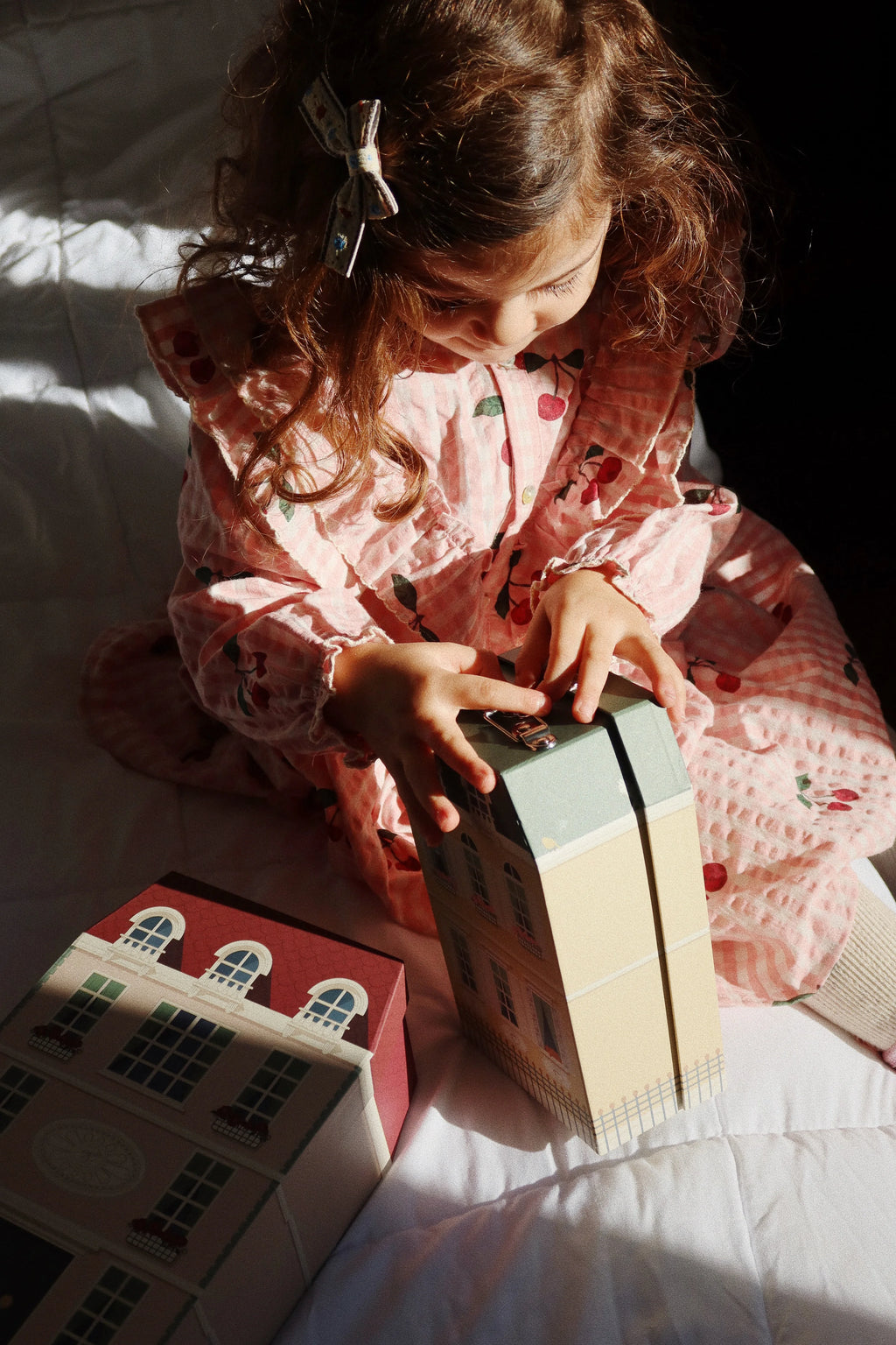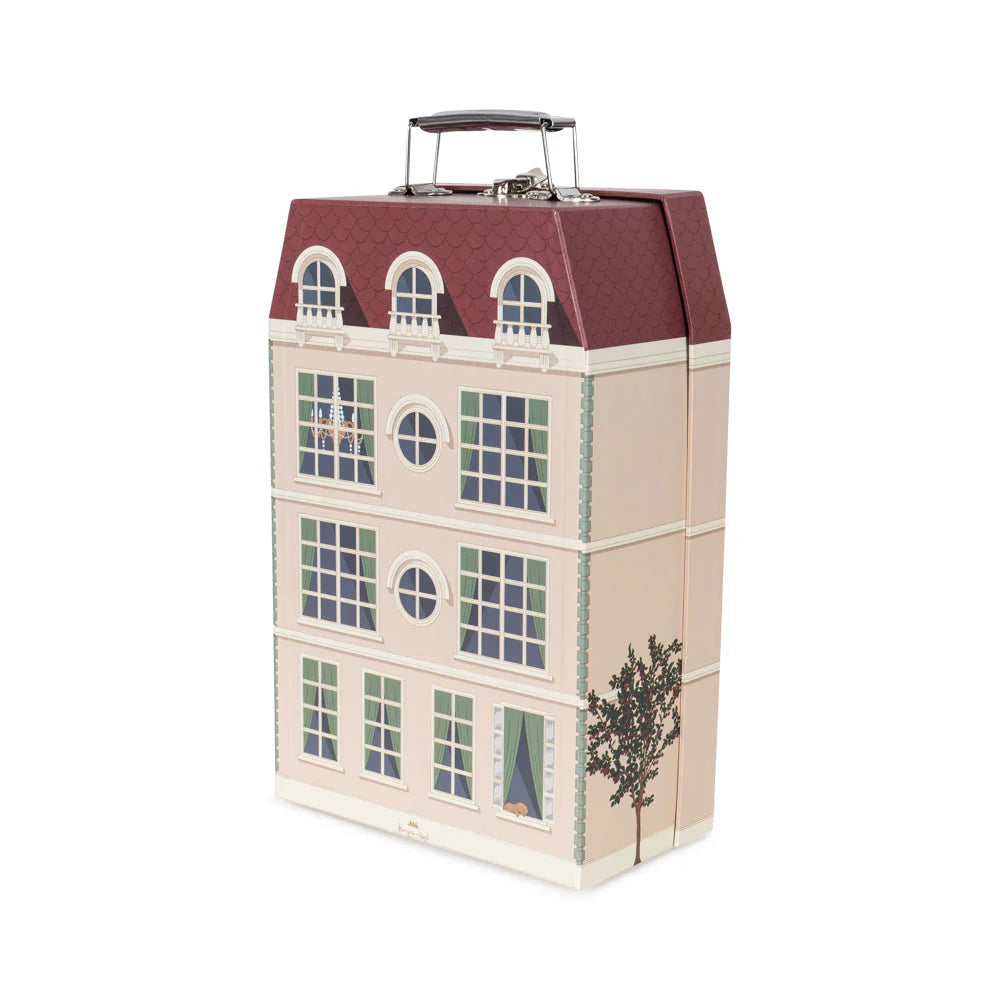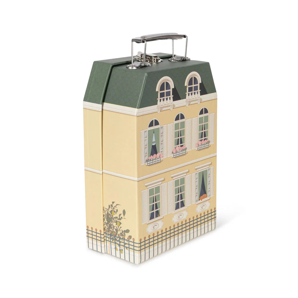 Set of two cardboard suitcases for storage and play. Shaped like charming boutique hotels. The smaller suitcase fits into the larger one.