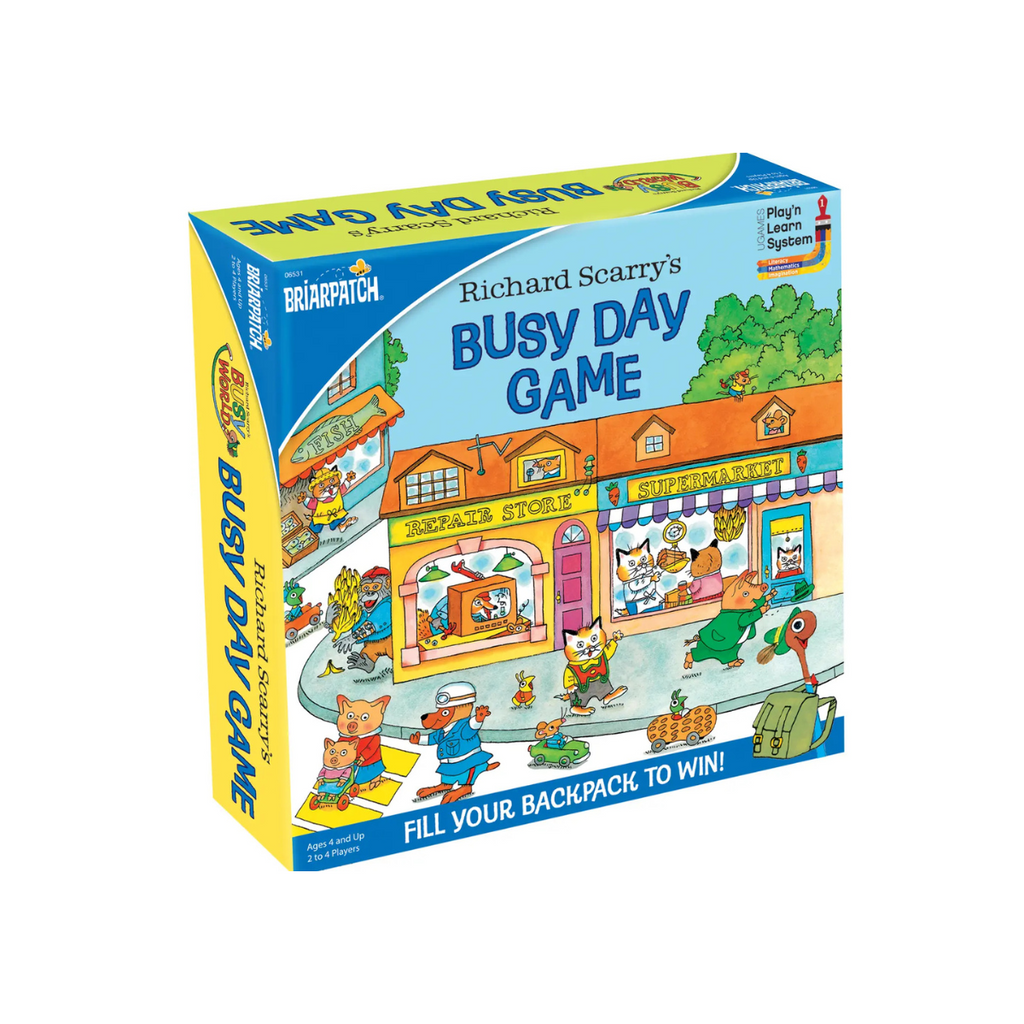 Dive into Richard Scarry's busy world by rolling the Jumbo Foam Die and visiting different areas around Busytown. Players will put on their thinking caps to collect all the items and fill their backpacks before heading through the 3D Pop up Busytown Entrance and winning the Busytown Prize. Join Huckle Cat and Lowly Worm as you make your way through a Busytown adventure, racing around Busytown to search for different objects from the farm, airport, beach and market in this fun-filled competitive preschool game.