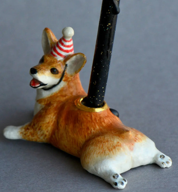 Transform your celebration into a whimsical affair with this adorable Corgi Cake Topper. Crafted from heirloom-quality porcelain, this hand-painted masterpiece captures the playful essence of this beloved creature. Adorned with a festive party hat, it's the perfect addition to birthdays, weddings, or any special occasion.