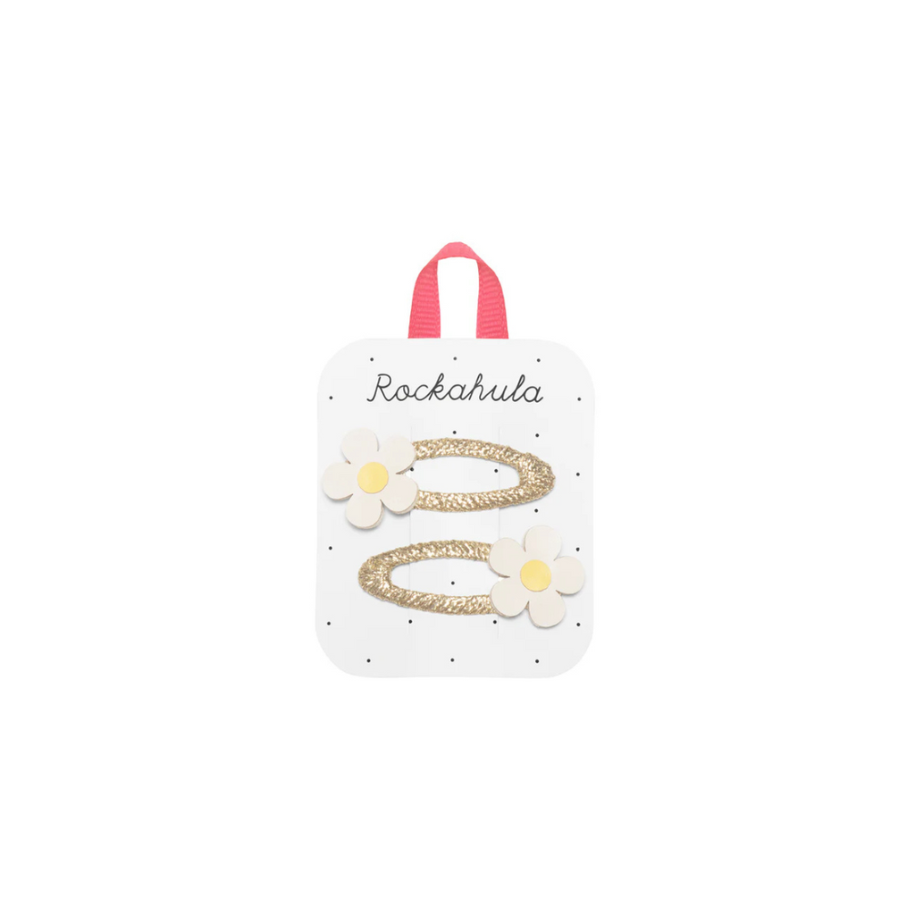 Smell the flowers this spring with our Daisy Daisy Clips. Two vibrant flowers adorn gold glitter ribbon wrapped snap clips. Made with recycled felt and PU. Contains small parts and is not suitable for children under 36 months.