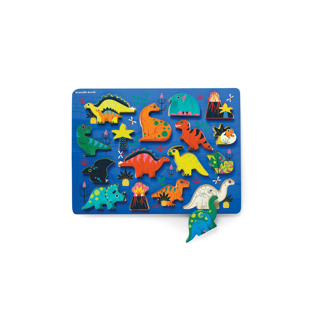 It's a puzzle! It's a playset! The Let's Play Dinosaurs puzzle from Crocodile Creek is a wonderful early learning puzzle with 16 different chunky wood pieces that match an underlying image! With stand-up chunky pieces and a beautifully illustrated play scene on the reverse side, it can also be a playset that is perfect for interactive and imaginative play.