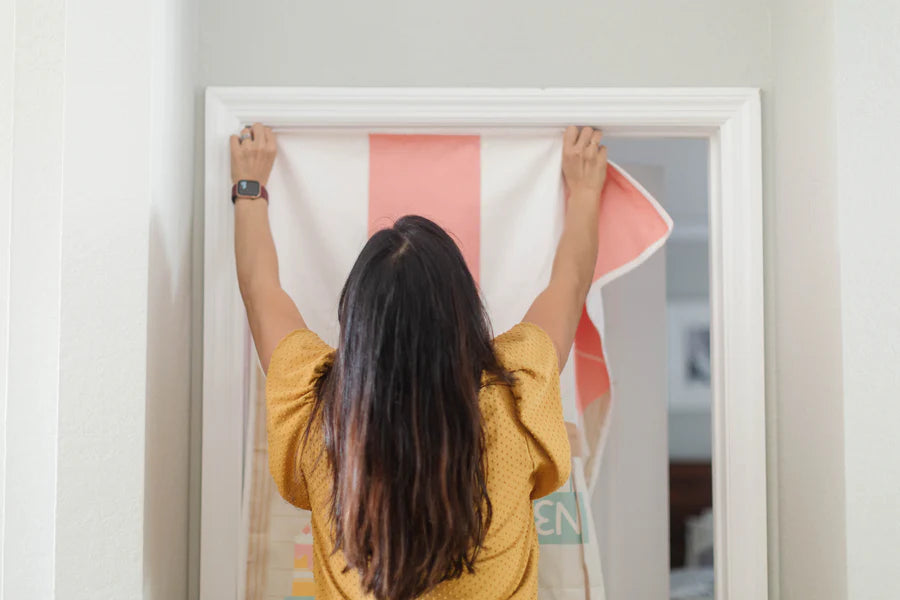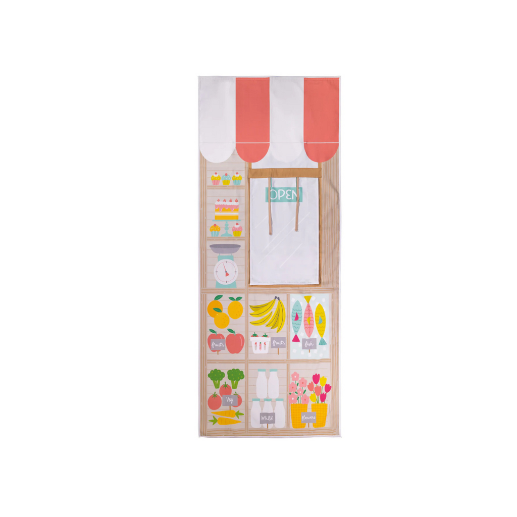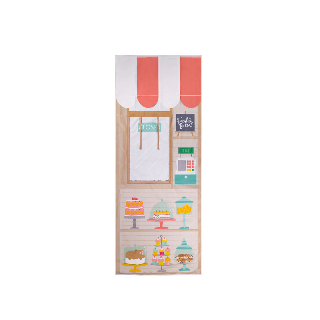 This canvas two-in-one storefront playset is easy to hang, takes up almost no space, and inspires hours of pretend play. One side is a farmers' market printed with a weighing scale, produce, flowers, and more. The other is a bakery showcasing beautiful glass-topped cakes, pastries, and a cash register.