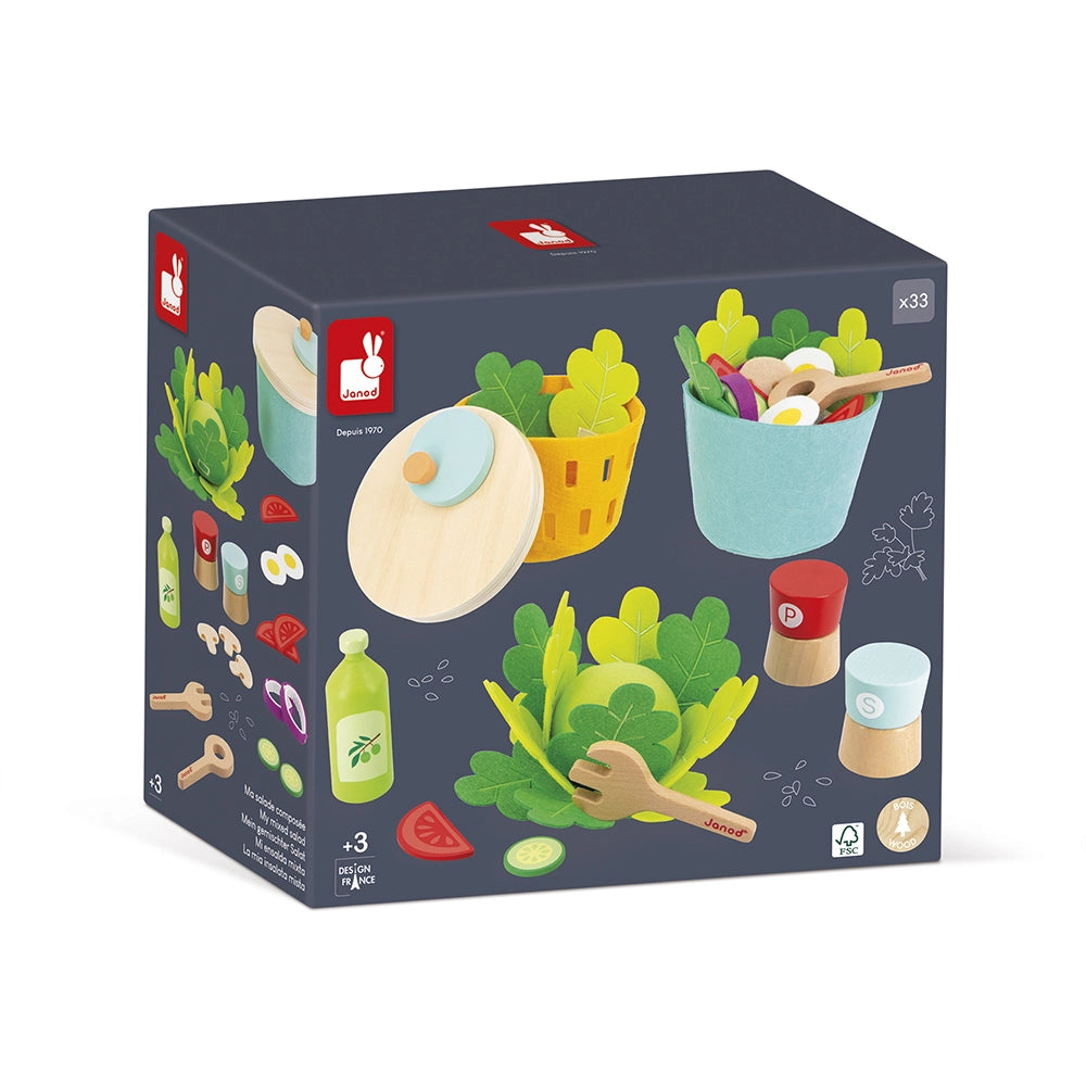 1 leaf, 2 leaves... and the leaves are off the lettuce! Then put them in the spinner, turn it, and once the water has been removed your child can prepare his summer salad from A to Z. Eggs, onions, cucumbers, tomatoes, mushrooms, a few grains of salt and pepper, and a dash of olive oil for a successful recipe! A total of 33 wooden and felt accessories to develop the imagination. Little extra for this product: the salt and pepper go 'click' 'click' when you turn them. Wooden toy FSCTM. Role-play toy for children aged 3 years and up.