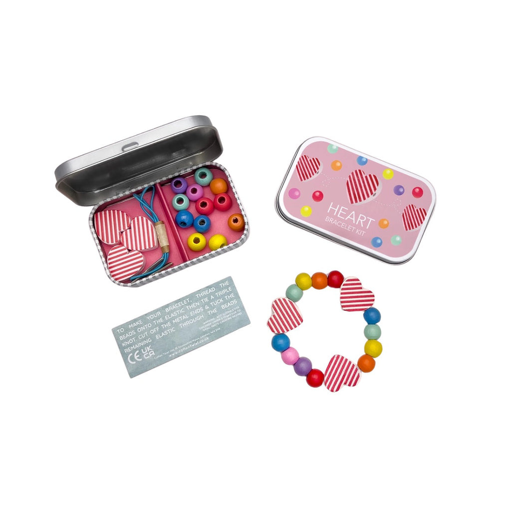 A beautiful gift tin containing elastic and beads to create a heart bracelet fit for a princess. The elastic comes with metal ends to help children add beads with ease. The tin can be used to store the bracelet, or a special trinket.