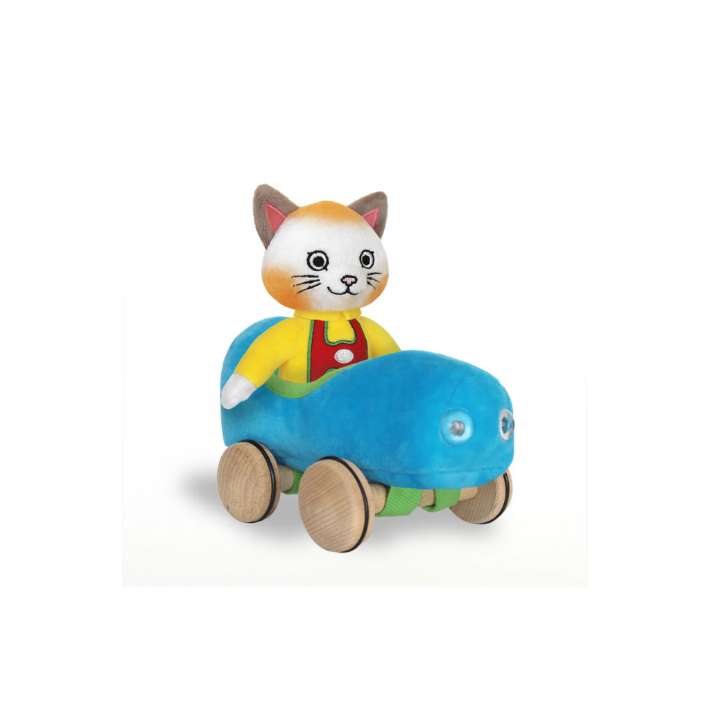 Prominently popular in Busytown, Huckle Cat Soft Toy is made of soft snow-white plush with orange accents and dressed in a bright yellow shirt, gray pants, and red suspenders. True to Scarry's original illustrations, Huckle Cat's eager embroidered face and perked-up ears show he's ready for a fun-filled day. Huckle Cat Soft Toy sits comfortably in his soft blue plush go-cart with working wooden wheels, clear plastic headlights, and contrast interior.