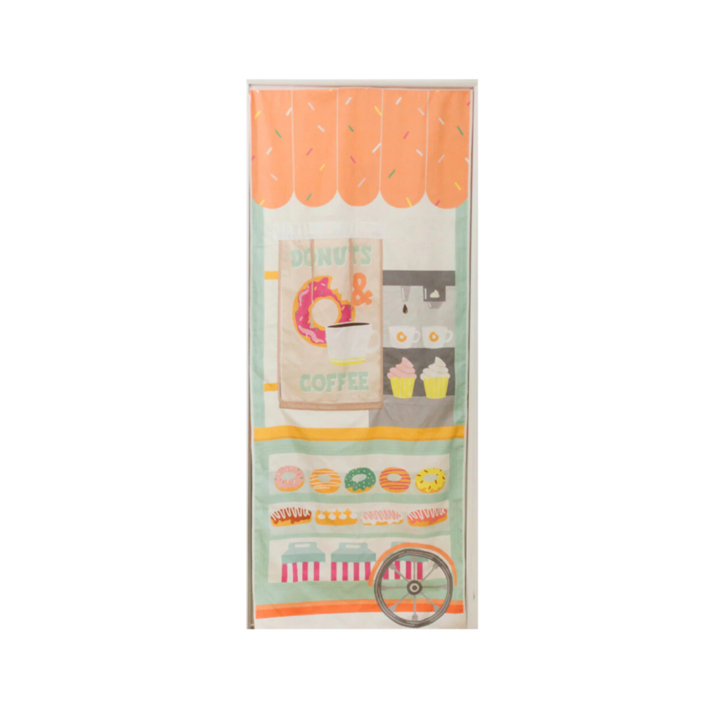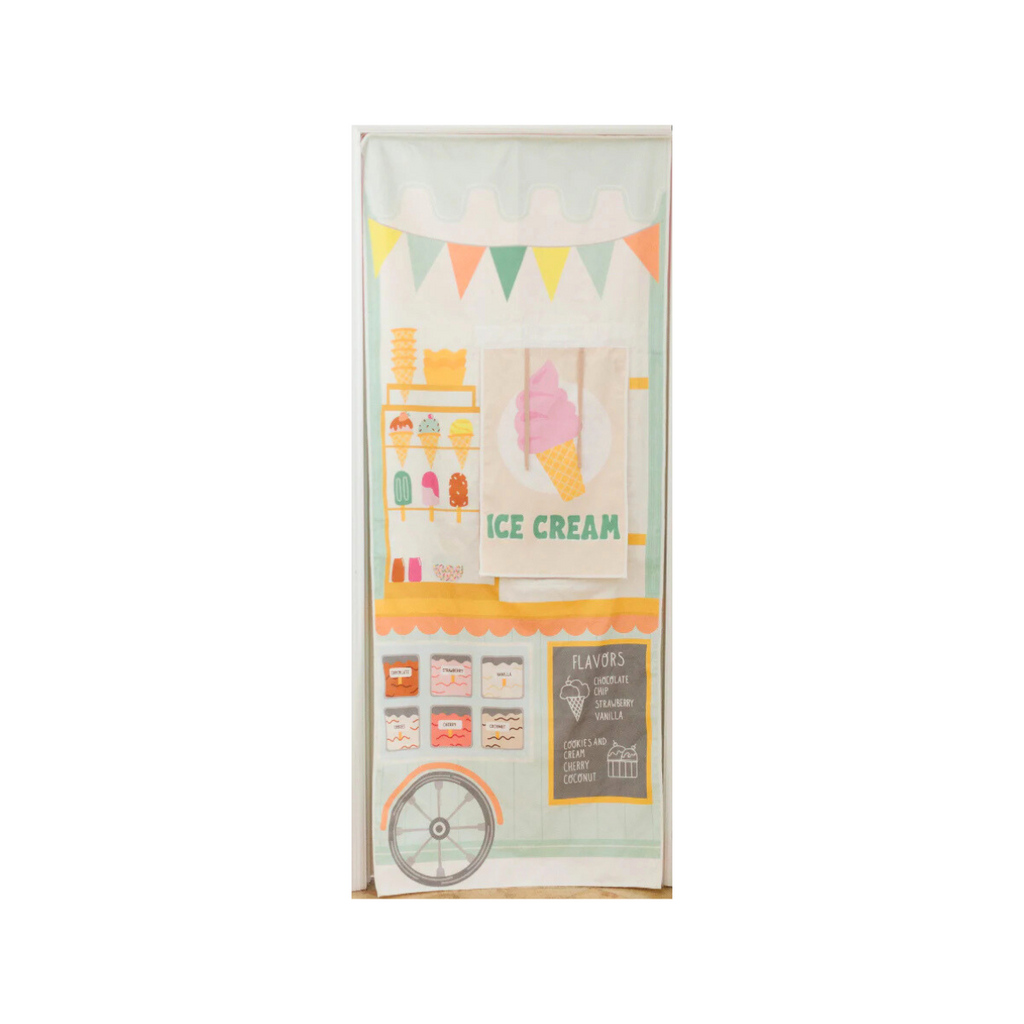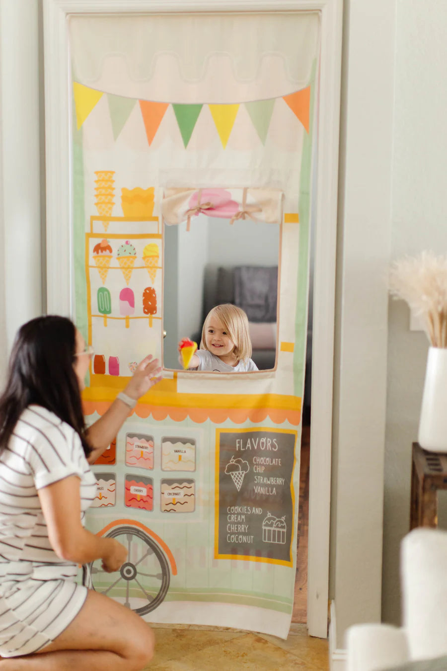 The Ice Cream & Coffee play shop is a two-in-one storefront play set made from machine-washable poly-cotton canvas, is easy to hang, and takes up almost no space to inspire hours of pretend play.