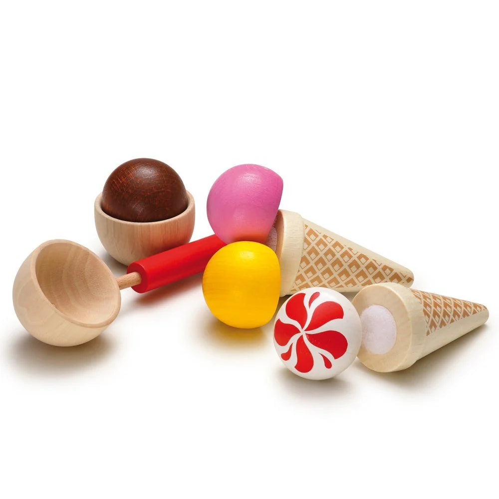 Loads of fun and a variety of options for serving scoops of ice cream. It truly is a party! This all-wood set includes: 1 ice-cream scoop, 1 ice-cream cup, 2 ice-cream cones, 1 scoop of strawberry ice cream, 1 scoop of chocolate ice cream, 1 scoop of yellow ice cream, 1 soft ice-cream with strawberry topping. Beautifully made and sized for small hands.