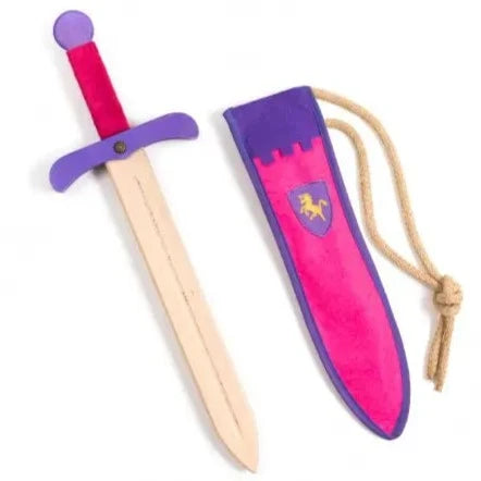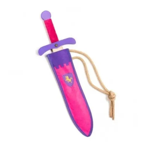 Very durable beech wood sword. Handle covered with suede very pleasant to the touch. Felt pouch with border, felt castle and natural cord to tie it at the waist. Shield with embroidered unicorn.