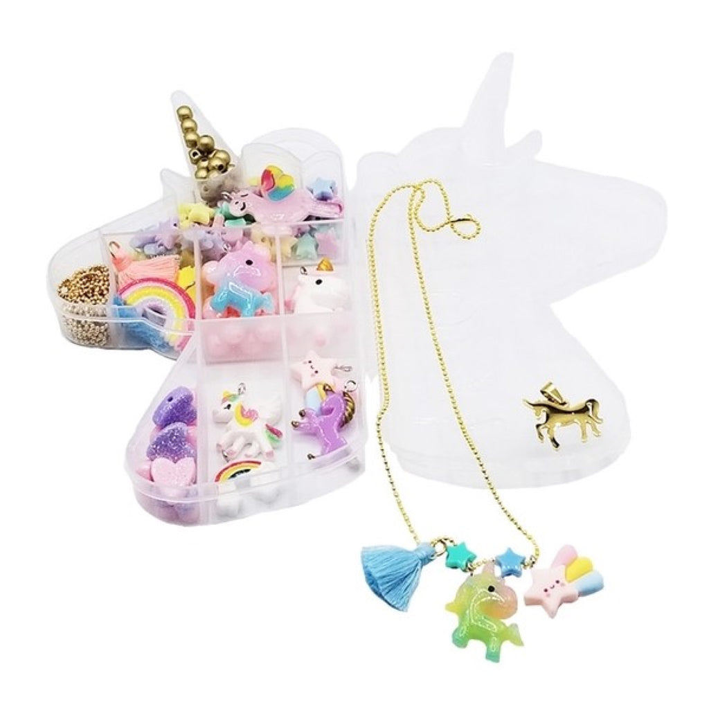 Bottleblond's unicorn jewelry DIY kit is packaged in an acrylic unicorn-shaped container. Each kit comes with 7-8 unicorn-themed charms, including one high-quality 18k gold plated unicorn pendant that can be worn on more formal occasions. Also, 60 inches of gold plated micro-ball chain, clasps, tassels, beads, and a few other goodies are included to make your budding jewelers smile!