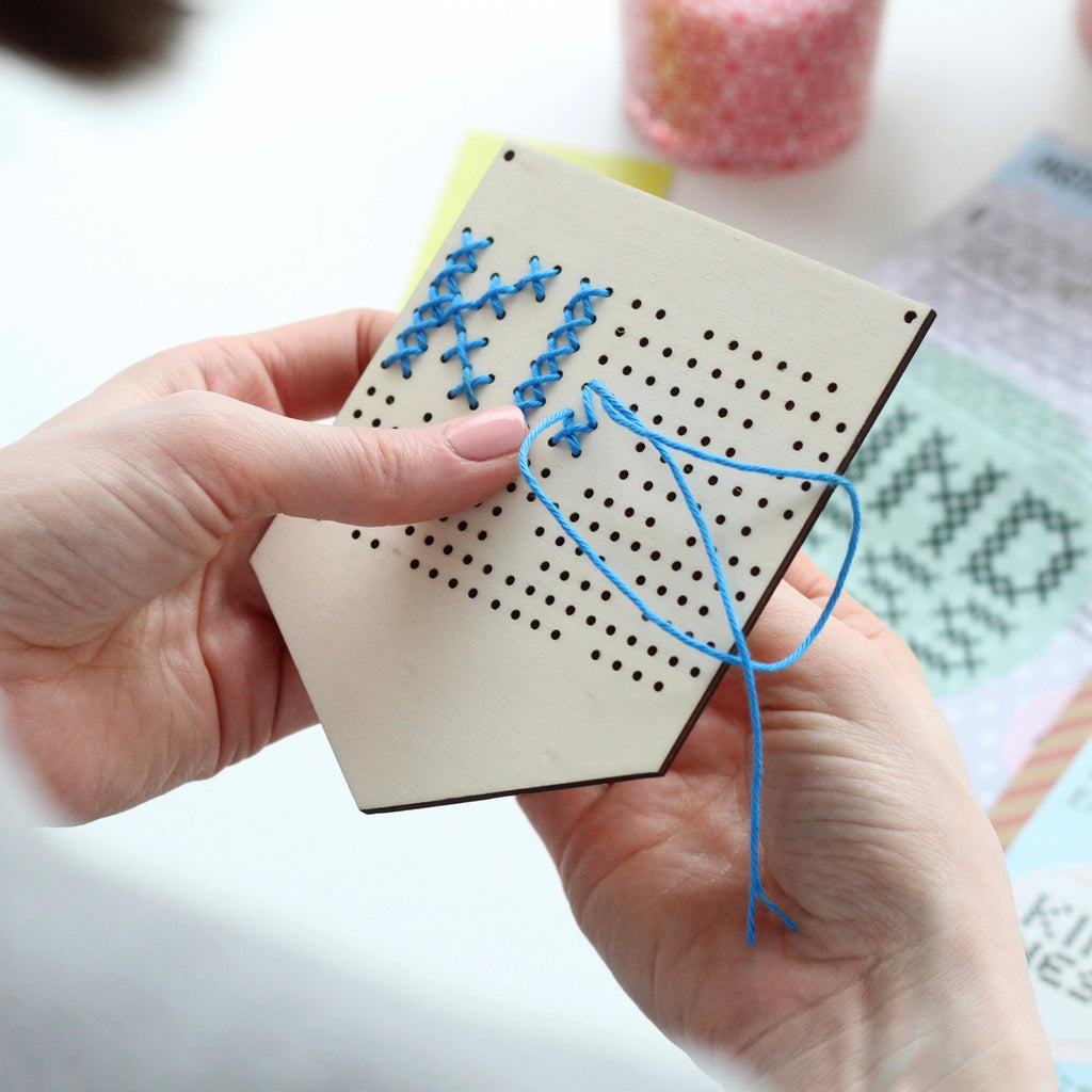 Everything required to complete this kit is included: laser cut board, thread, needle, cord to hang and instructions.