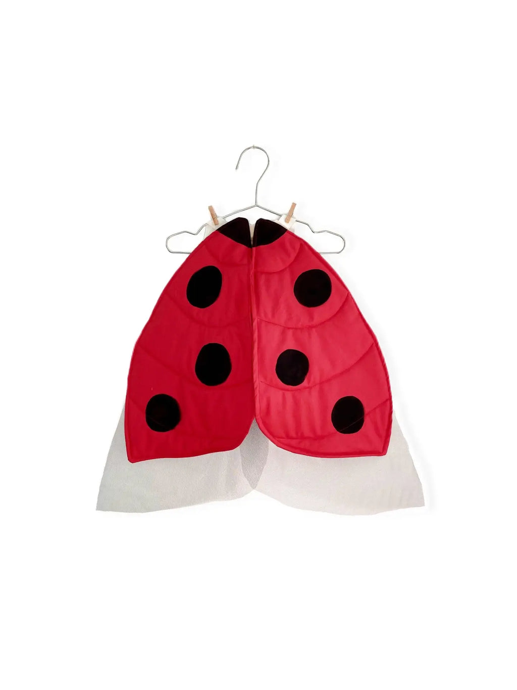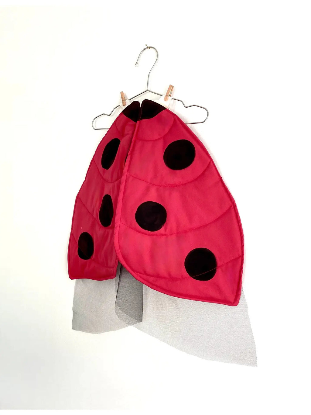 Does a ladybug dress up? Every day! Ever the classic, this ladybug costume continues to charm toddlers and children alike with cranberry colored wings, hand-painted spots and two tulle under-wings.