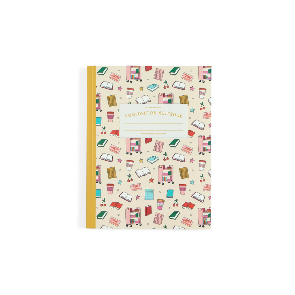 Celebrate your love for reading with the Library Books Composition Notebook! Featuring a playful design of book carts, library cards, and coffee cups, this wide-ruled notebook is perfect for journaling, note-taking, or keeping track of your lists. With 160 pages, it’s a great companion for students, teachers, librarians, and book lovers. A fun and functional gift for anyone who finds joy in the library!