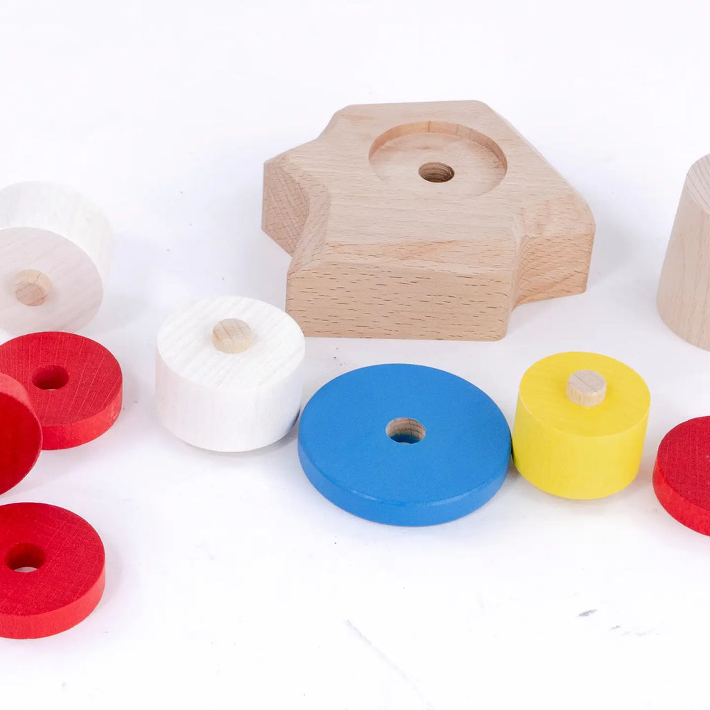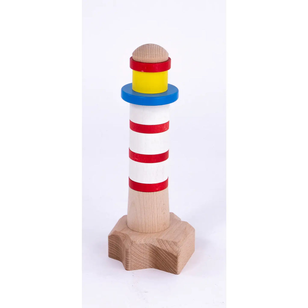 A wooden lighthouse toy that is designed to add rustic charm to a nursery or playroom and can be stacked. Consider creating a cylindrical base for the lighthouse and smaller stacked pieces resembling the lighthouse. Stack the pieces to complete the lighthouse structure.