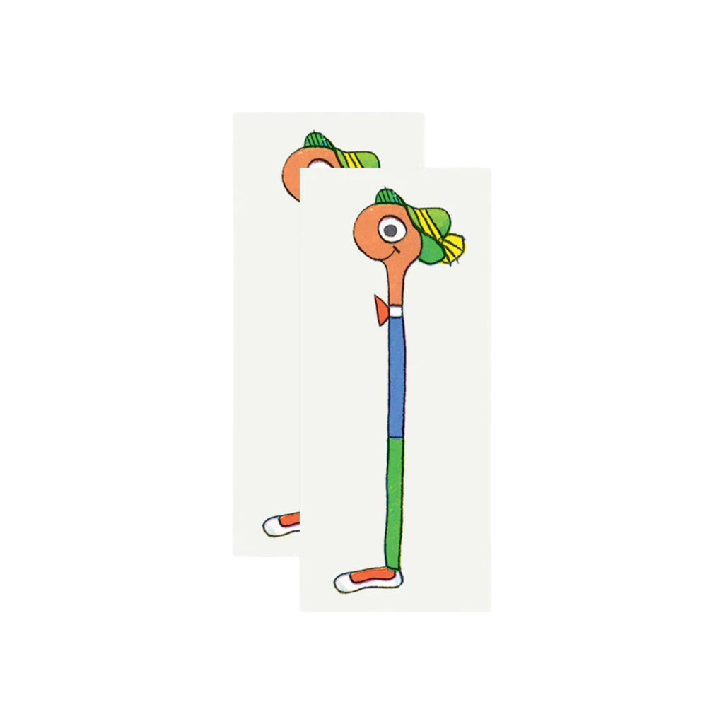 Behold, Lowly Worm standing tall (for a worm!) in his iconic green hat, bow tie, and red sneaker. This tattoo pair—featuring the wriggly wonder from the books of author and illustrator, Richard Scarry—is perfectly pint-sized.