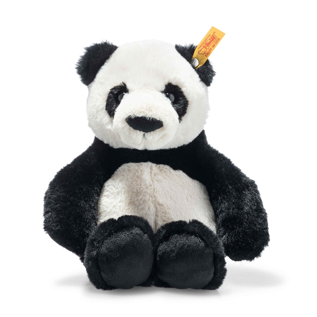 Ming Panda is made of shiny black and white plush and comes with contrasting paws and a compact, cuddly soft body. He has cute, matching fluffy ears with a stainless steel "Button in ear". The black fur around his eyes and on his shoulders, arms, and legs are characteristic of his species. Ming cannot wait to join you on all of your future adventures!