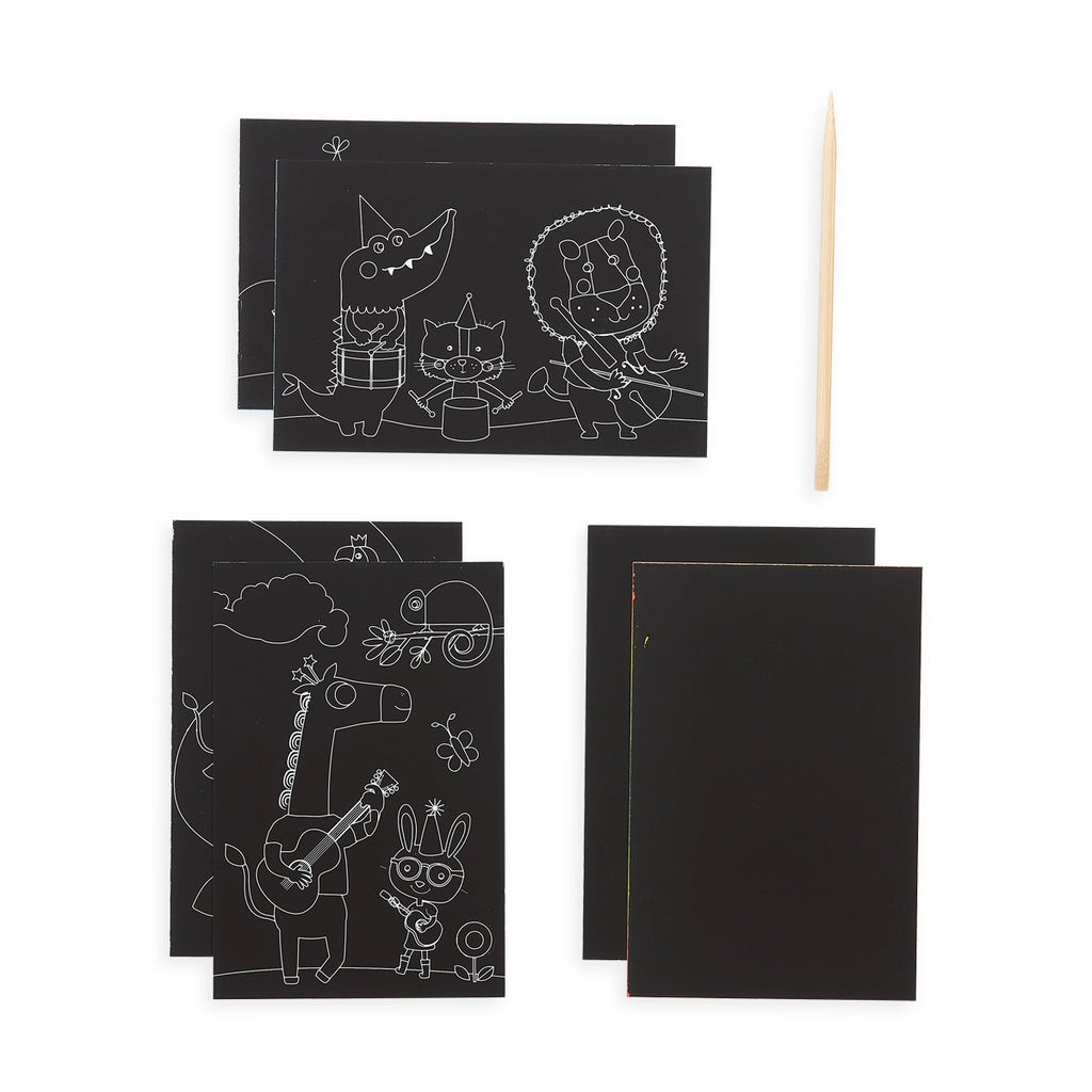 Mini Scratch Art Kits include four different illustrated scratch cards (4 x 6"), 2 rainbow scratch cards (4 x 6"), and one wooden scratching tool