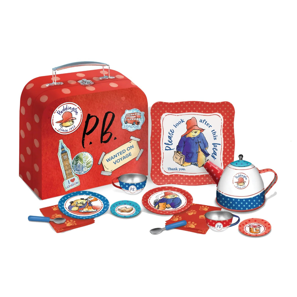Paddington 14-piece Tin Tea Set has all the essentials to create impromptu tea parties. Set includes teapot with lid, serving tray, 2 cups, 2 saucers, 2 plates, 2 spoons, and 2 napkins which all fit nicely in a sturdy printed suitcase printed with travel stamps of Paddington's adventuress. Decorated with illustrations from the original Paddington books, this deluxe tea set is designed for paw-fectly delightful tea times.