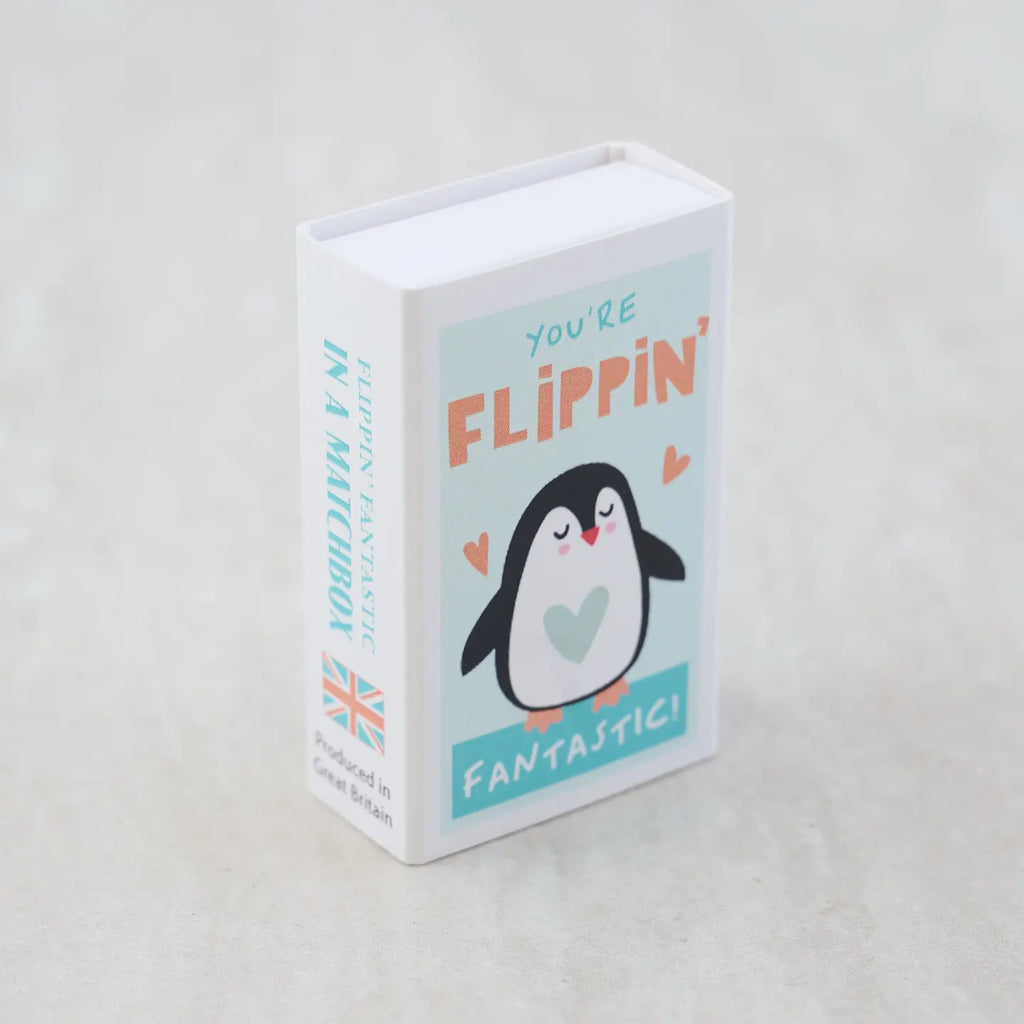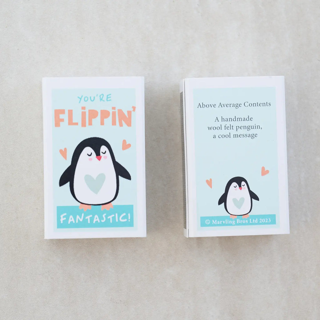 Show them how special they are with this beautiful handmade wool felt penguin in a matchbox. This cute matchbox with the message’You’re Flippin’ Fantastic’ is an ideal gift for a friend or loved one, to show them how much they mean to you.