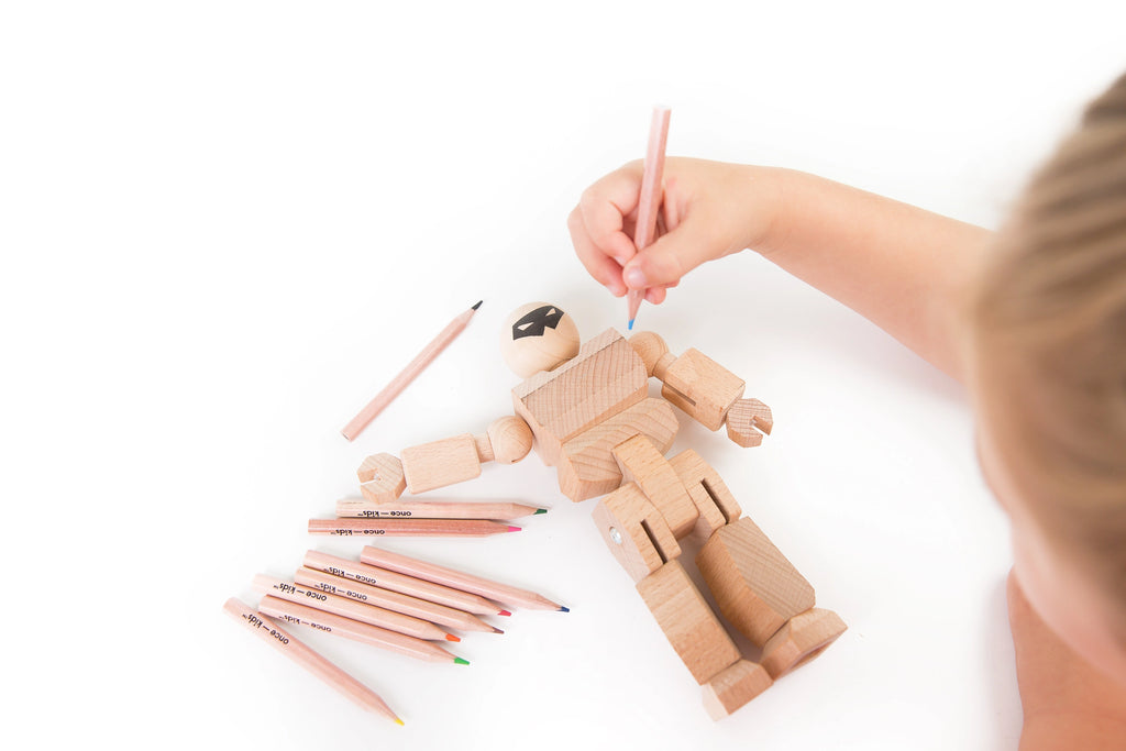 Playhard Hero DIY is a natural and biodegradable wooden action-hero. Made entirely of strong wood with articulated sections connected by elastic string and metal joints, this playtime hero has what it takes to stand up to whatever super villains come their way.