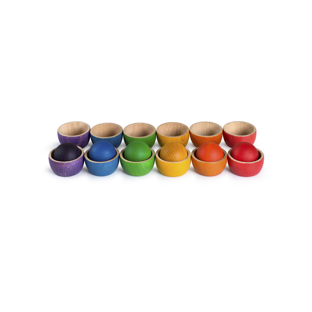 Includes 12 bowls and 6 balls in the colors of the rainbow.