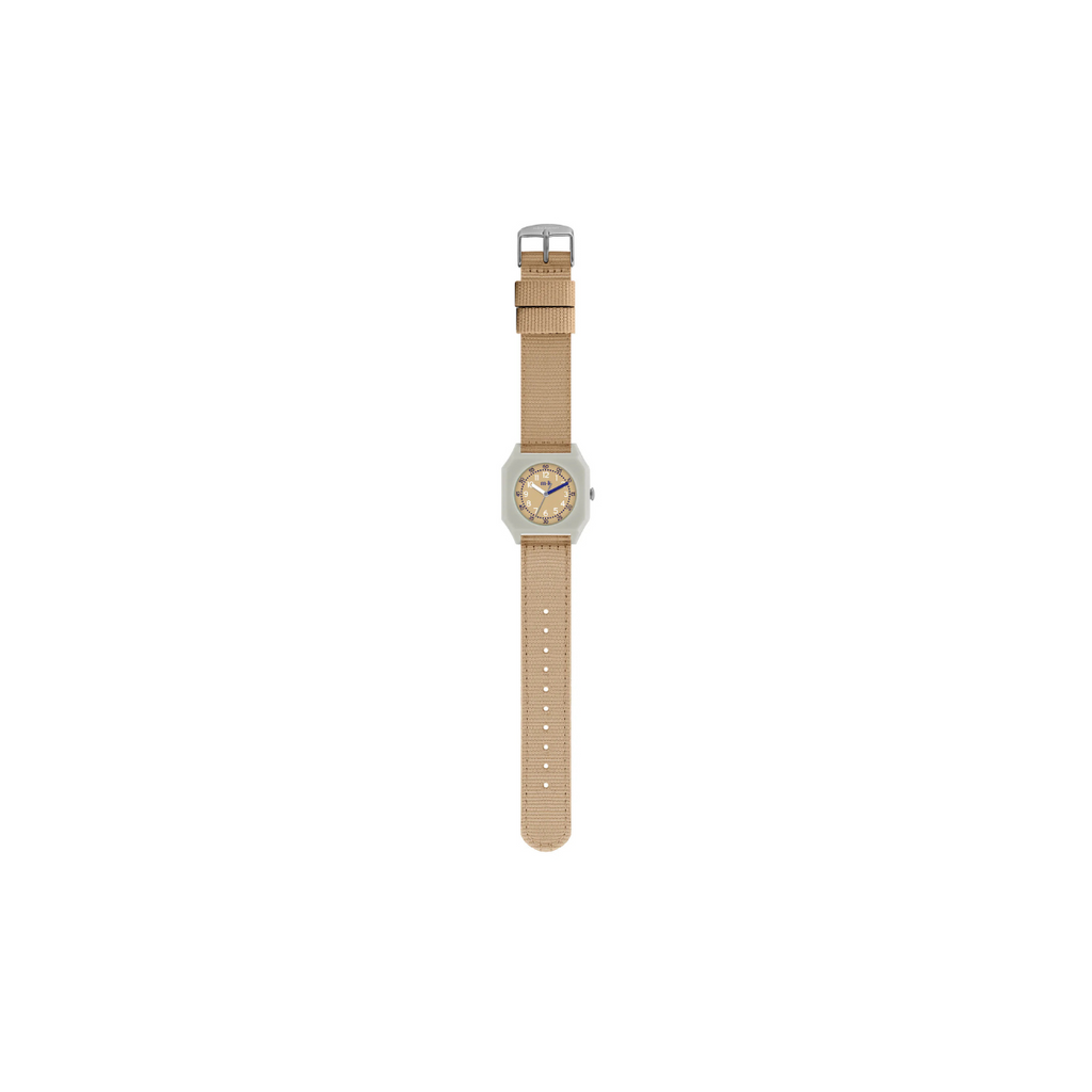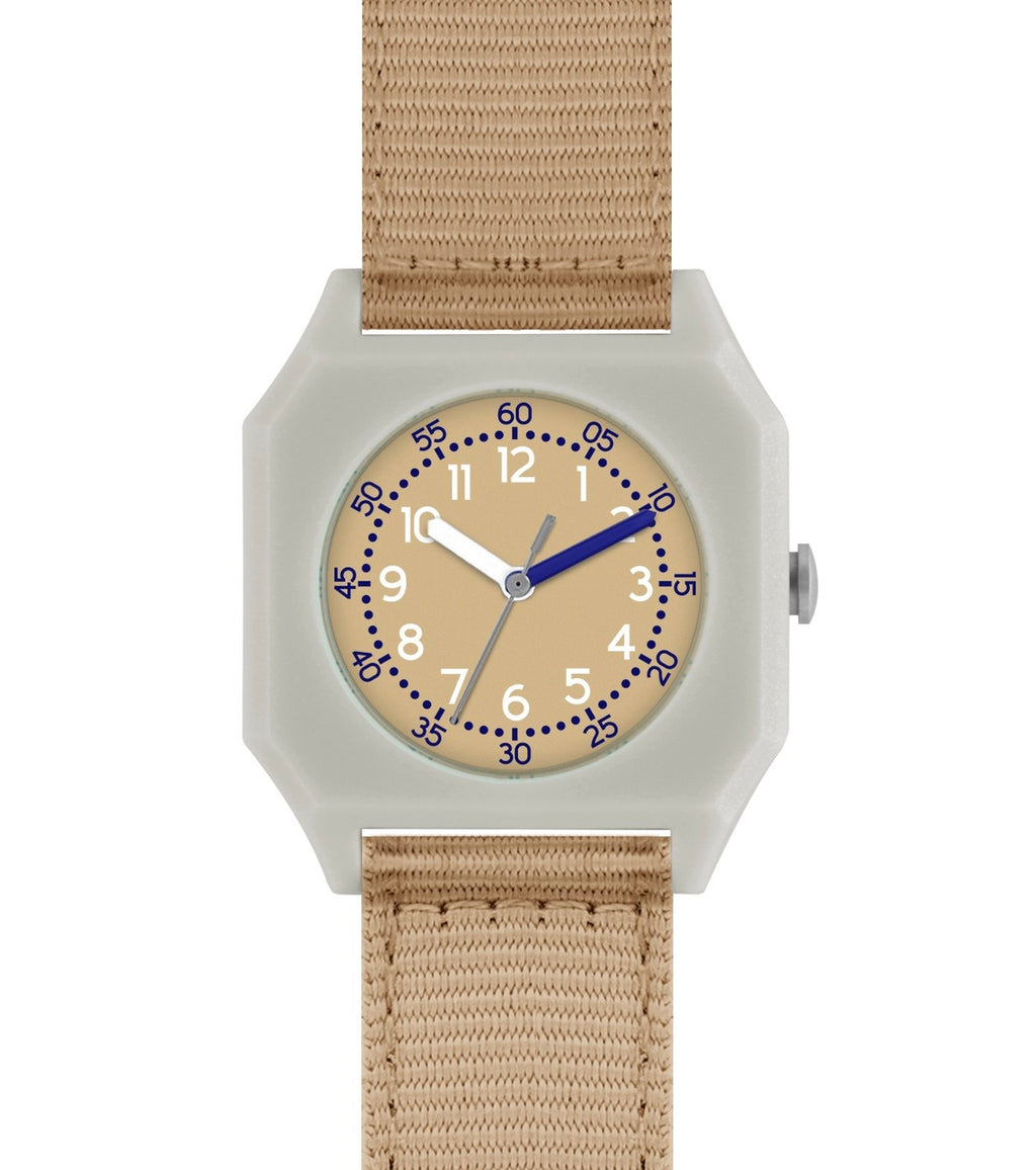 The watch has clearly readable dials with strong color contrast to make learning to read time an easy task. All hours and five-minute steps are written out, the minutes in-between are marked with small dots. The strap can be changed and mixed with other straps from the same collection thanks to an 'easy click' system, no tools needed!