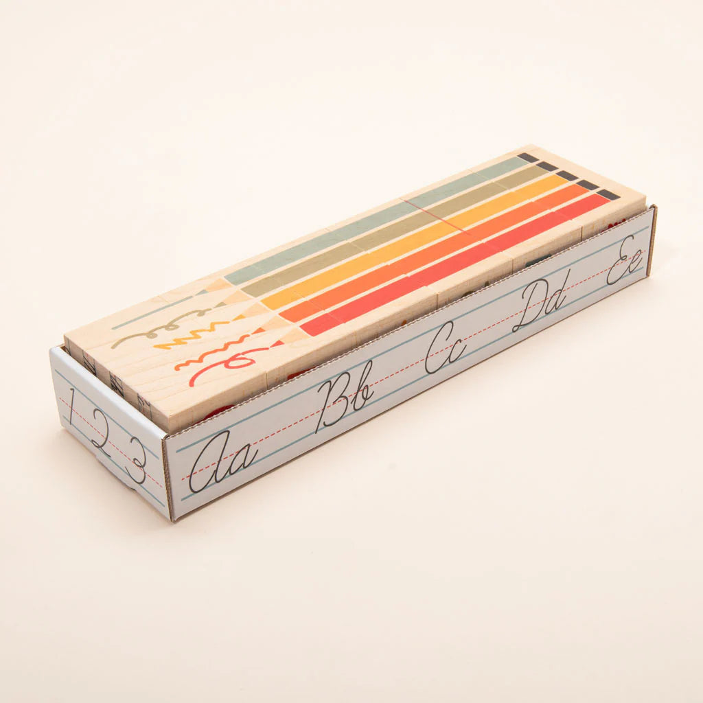 It’s time to go to school! Take the big yellow bus. Learn to write cursive. Measure 18 inches with a ruler. See colored pencils and how they scribble. Count to six. Will you give an apple to your teacher? And will it have a worm in it? With more than 6 rectangular blocks, this artful set is a decorative puzzle.