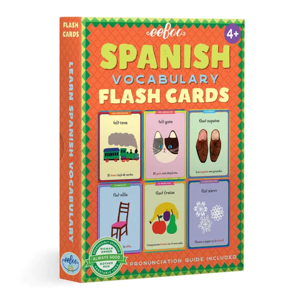 56 flash cards teach basic Spanish words about nature, animals, clothing, colors, things in the home, vehicles, and things at market. Each word is boldly illustrated and used in a sentence in English on one side and Spanish on the reverse.