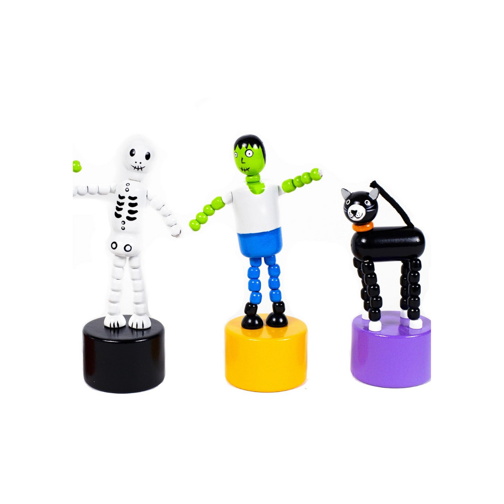 These push puppets are eerie-sistible! Push the button and they droop - then let go and watch them pop back into action. Set includes (3) styles: skeleton, frankenstein, and black cat.