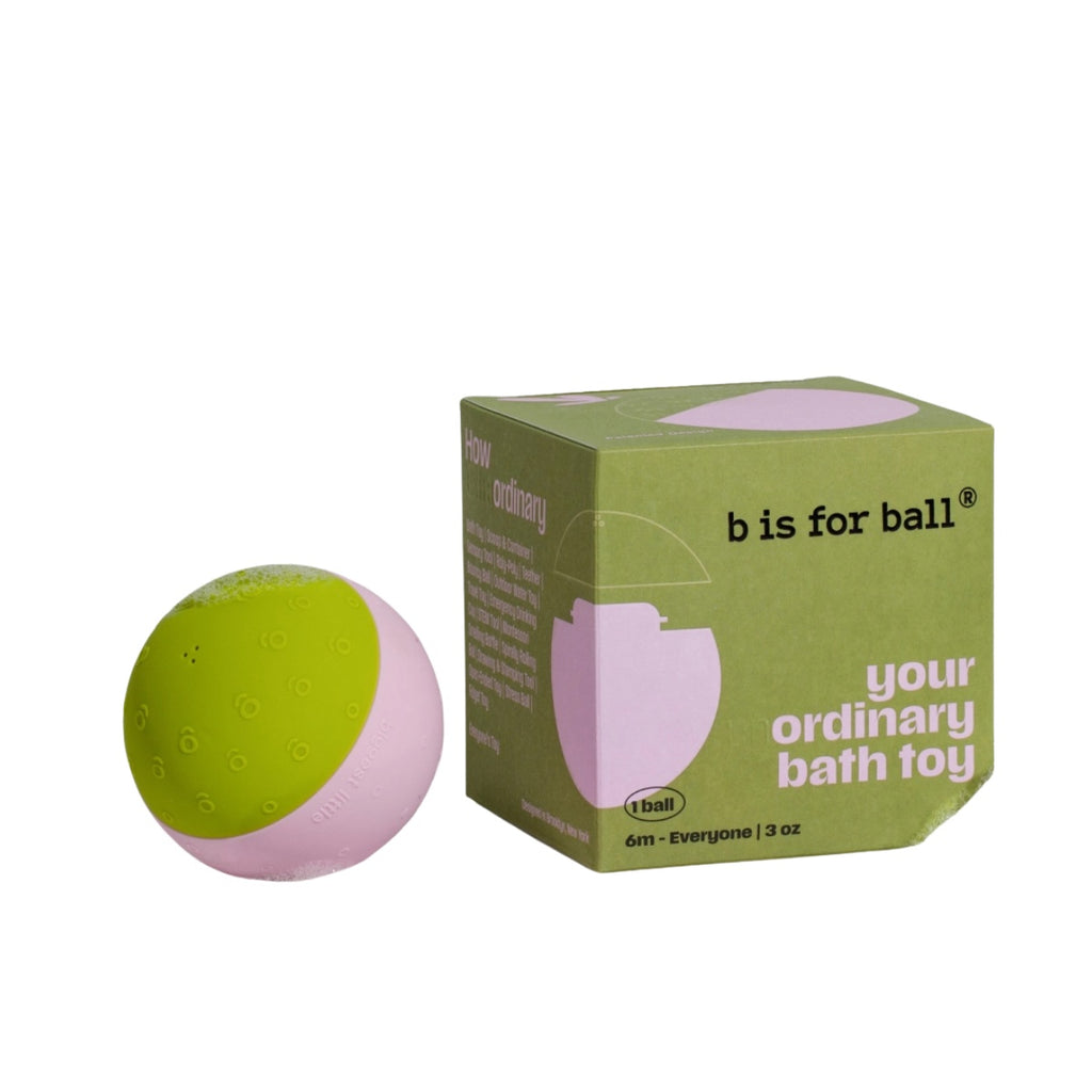 Tired of moldy, plastic bath toys that don’t last? Meet b is for ball® in strawberry matcha, the patented bath toy that transforms bath time.