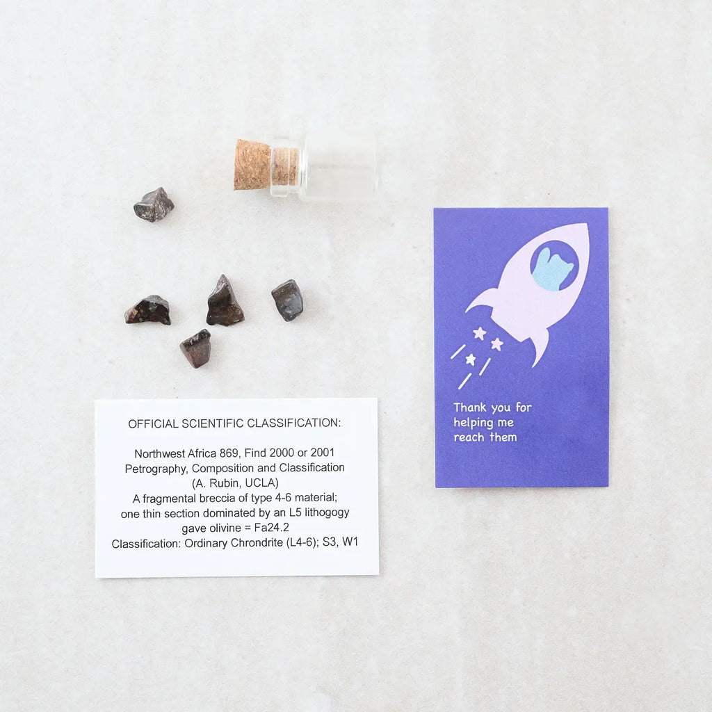 Open the matchbox to reveal the wonderfully heart-warming message ‘Thank you for helping me reach them’, and a bottle of genuine meteorite chips. Also included is a certificate of authenticity with the official scientific classification details of your meteorites, a must for any astronomy geek or astrology fan.