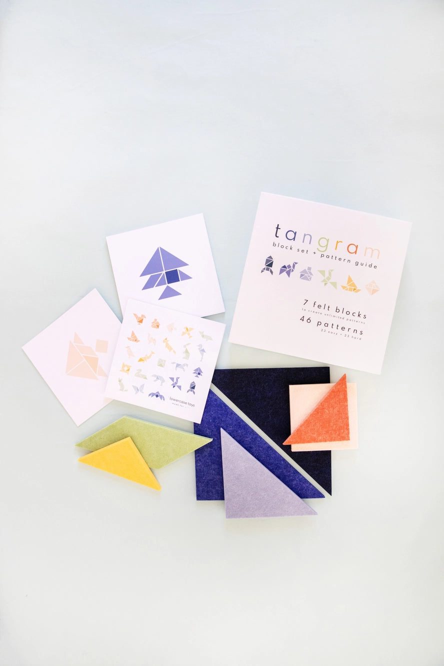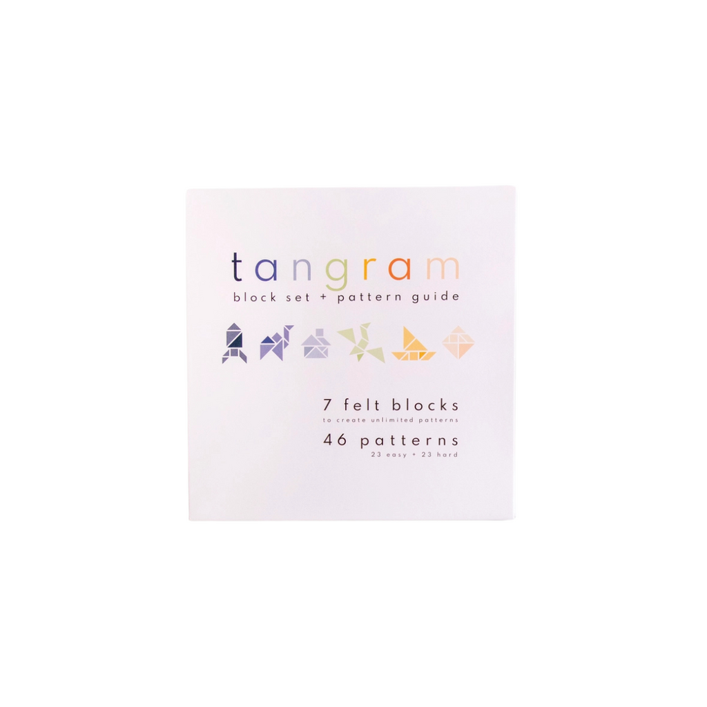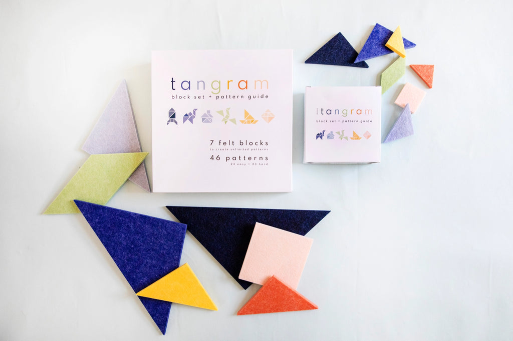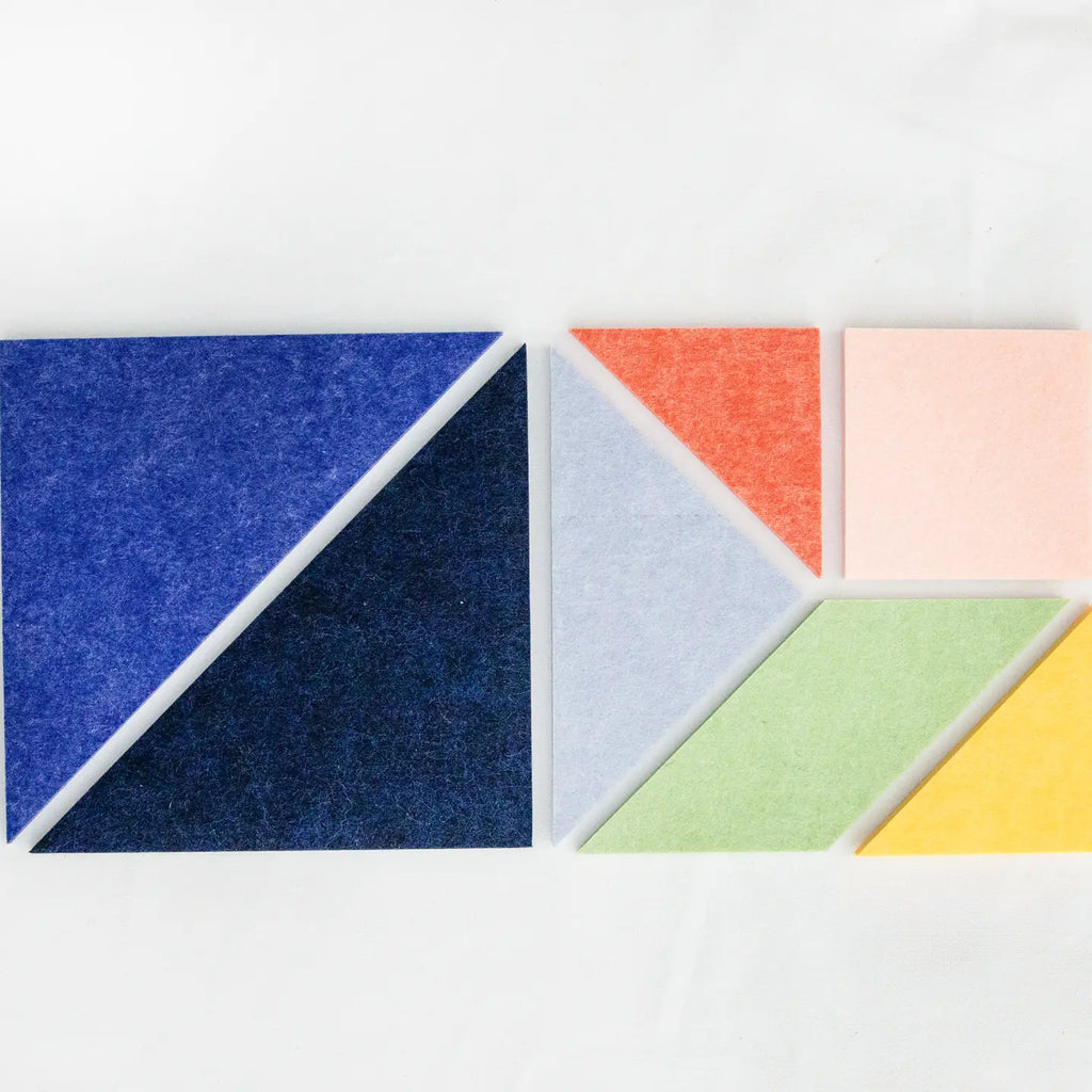 A classic for a reason - these sturdy, floor sized felt blocks are perfect for spatial reasoning filled afternoons. Made from recycled water bottles, felt tangram blocks are lightweight, sturdy, and ready for play. Includes all 7 necessary shapes and a pattern guide with 46 patterns (23 easy, 23 hard).