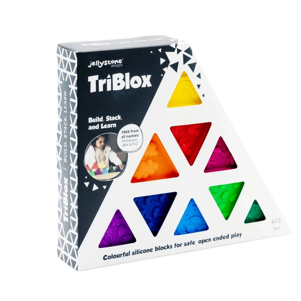 Introducing Jellystone Designs' Triblox! 9 Triangle Blocks made from toxic-free silicone that little ones can use to build, stack, and learn. Perfect for open-ended play, each colorful block features a number and corresponding illustration on the other side for added learning opportunities. Triblox is an excellent way for little ones to channel their own creativity and direct their own play!