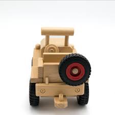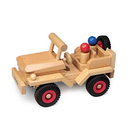 The front wheels of this wooden jeep may be turned by the wooden bar at the jeep's top. A great vehicle for small hands.