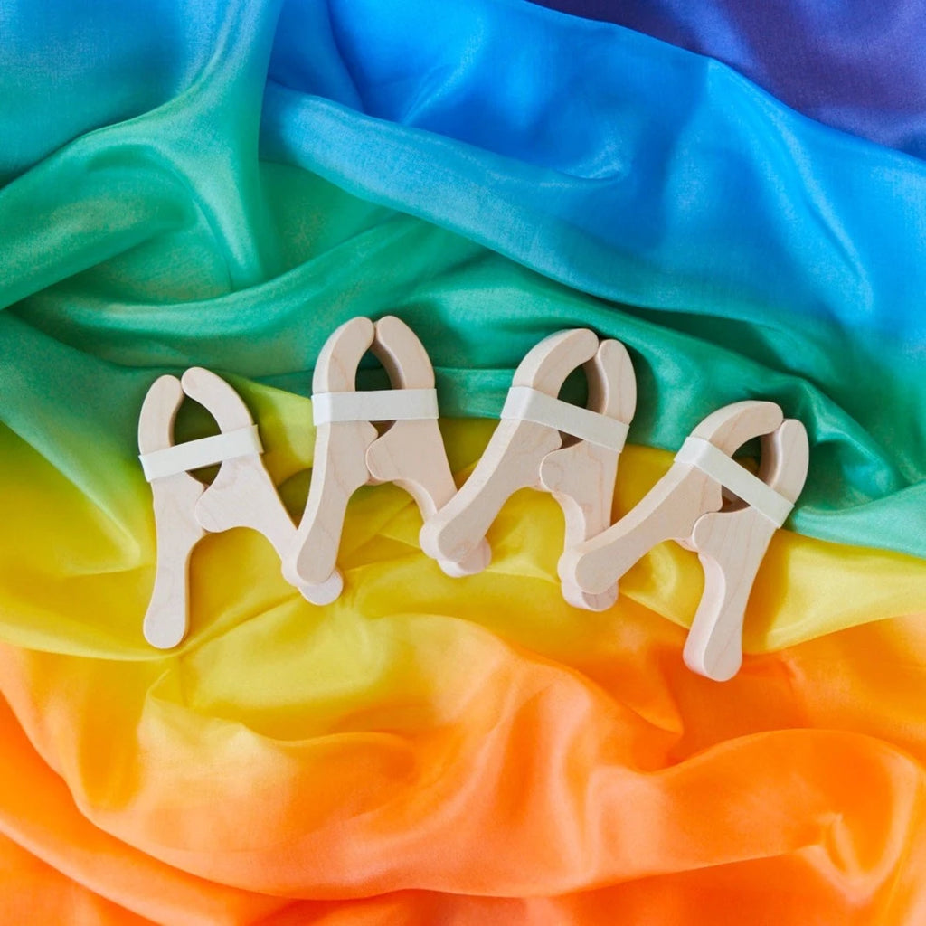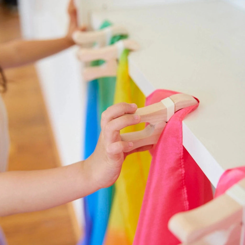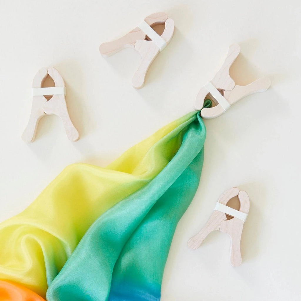 Playclips make fort-building and make-believe play easy! Playclips fit nicely in a child's hand while still having a sturdy grip. Children will use Playclips to clip Playsilks, Playcottons, and sheets, firmly together and onto imaginative play scenes.