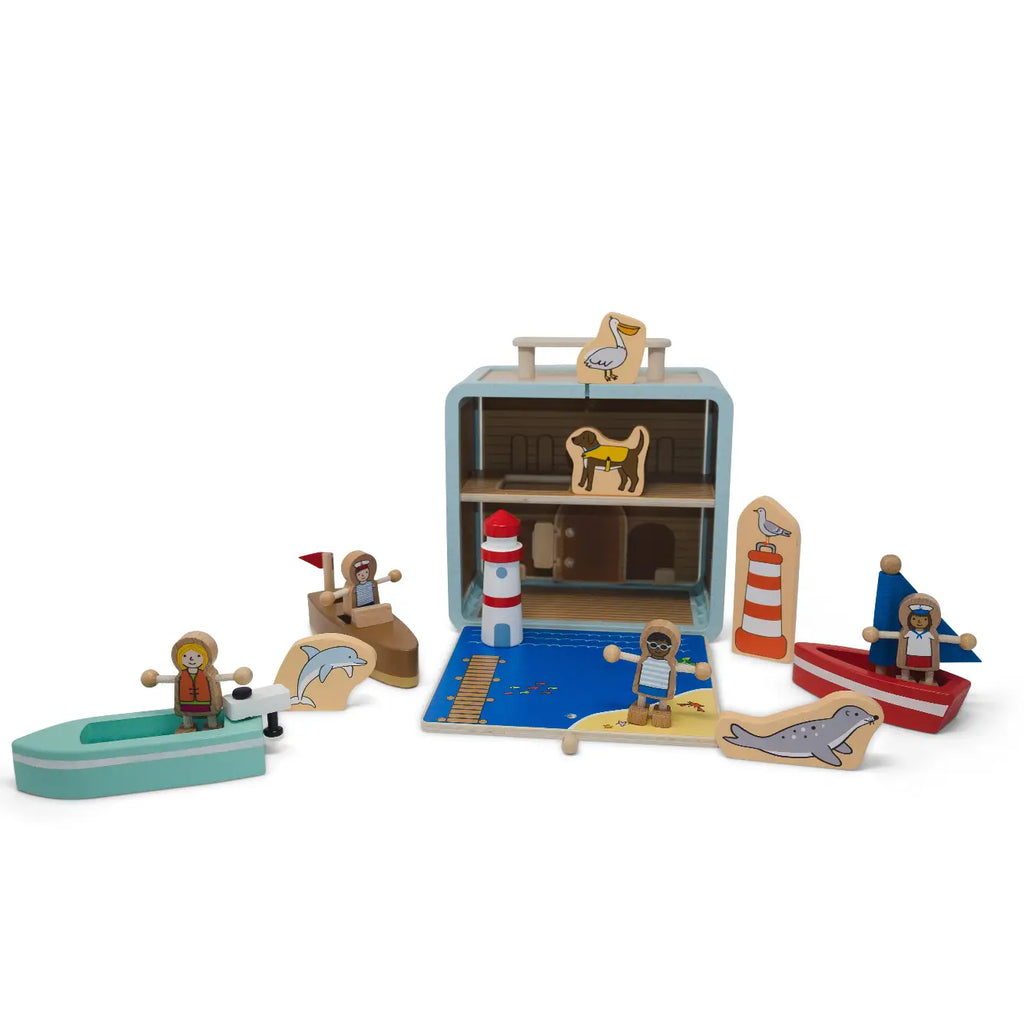 Each suitcase opens up on both sides to reveal a world of fun. The 13-piece Yacht Club has everything for whimsical fun on the go, including multiple boats, sailors, even a lighthouse and bouy!