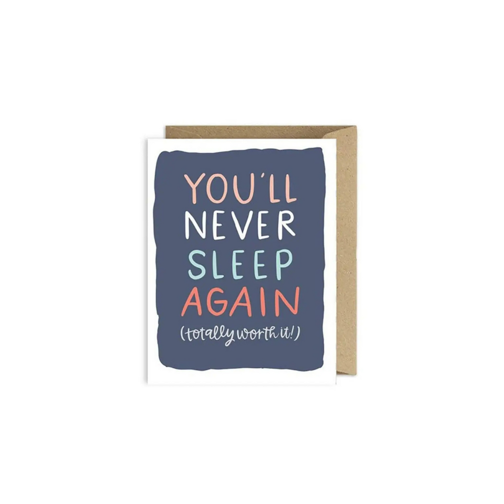 Celebrate the joyous arrival of a new baby with the "Never Sleep Again" Baby Greeting Card. This whimsical card captures the playful spirit of parenthood and the exciting journey ahead for new parents. Featuring a charming illustration of a sleep-deprived parent with a wide-eyed baby, this card humorously acknowledges the sleepless nights that come with the territory of welcoming a newborn into the world. It's the perfect way to send your congratulations to new parents and those expecting a bundle of joy. Send this card to share in the excitement of this special milestone.