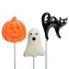 These grinning pumpkins, arching black cats and floating ghost shaped lollipops are sure to please the whole gang this Halloween. The pumpkins are orange, the ghosts are white cotton candy, and the cats are black cherry.