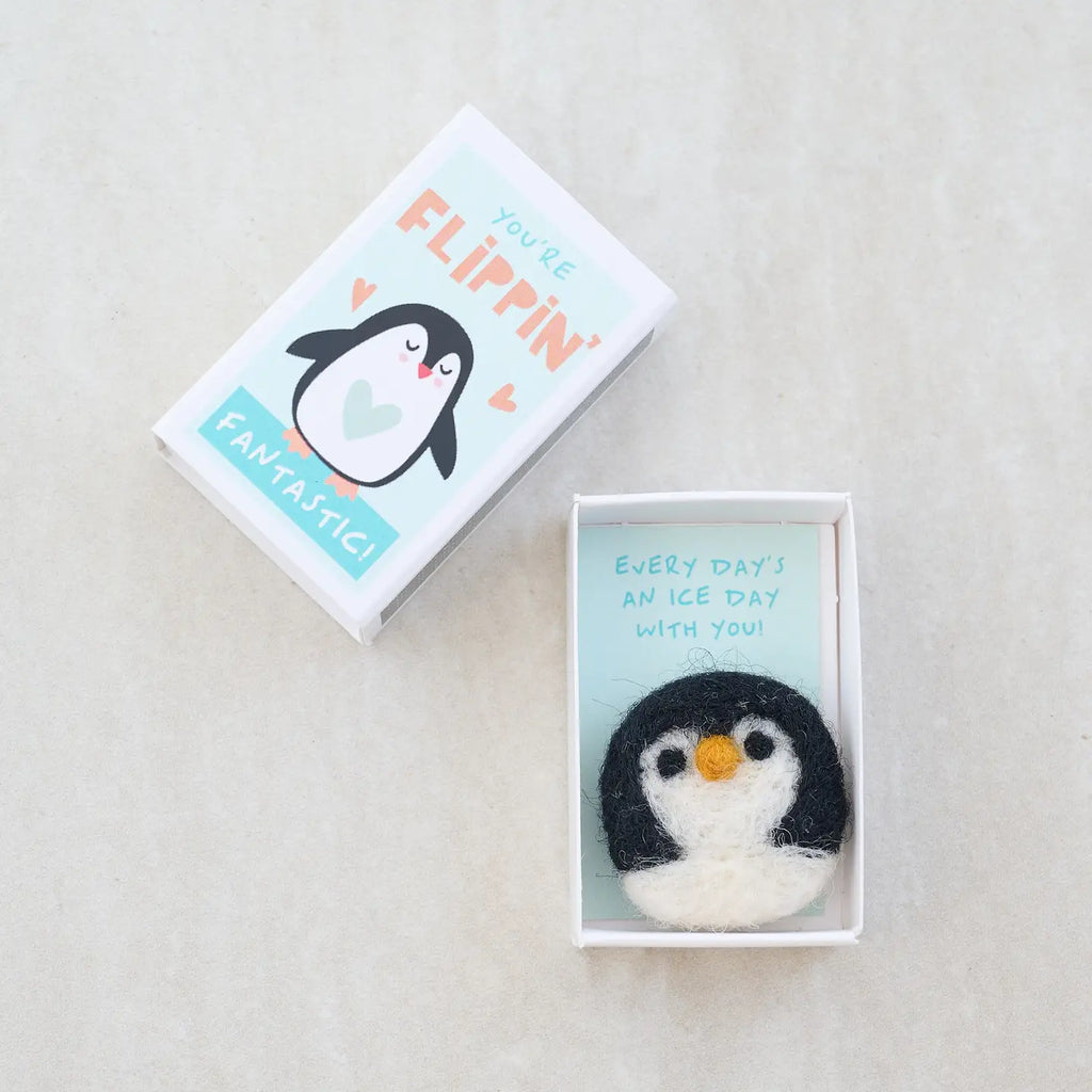 Show them how special they are with this beautiful handmade wool felt penguin in a matchbox. This cute matchbox with the message’You’re Flippin’ Fantastic’ is an ideal gift for a friend or loved one, to show them how much they mean to you.
