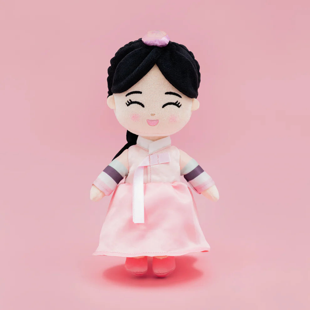 Meet Danbi — meaning “sweet rain” in Korean. This 9" Korean doll wears a traditional pink hanbok with ribbon and pastel sleeve details, inspiring little ones to celebrate culture through cuddly, inclusive play.