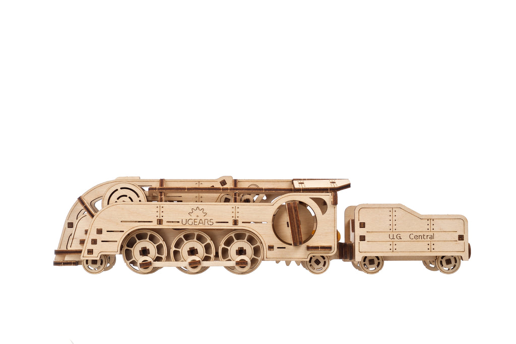 This is a DIY train model that anyone can build, including junior train enthusiasts. This rubber band-powered wooden train (locomotive plus tender) model has a surprising get-up-and-go in such a compact body and can travel 2 yards on a single winding. Sleek, retro styling harkens back to the 1930s—the last decade when coal-fired steam locomotives held prominence.