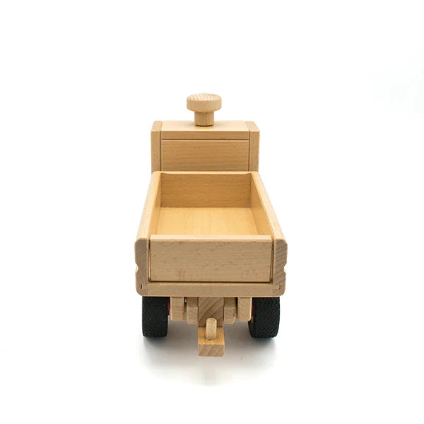 A steerable dump truck by Fagus, with two peg figures. The bed of the dump truck may be raised to dump a load of dirt, and then lowered to be filled with a new load. A hitch at the truck's back end allows a trailer to be attached for extra large loads.