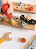 A woodpecker themed tool box filled with everything you need to build something on your own. With two removable lid pieces that turn into screwable plates, and a cloth printed bag to pack away after play, this set includes a woodpecker hammer, a pair of pliers, a screwdriver, a spanner, 2 screws, 2 bolts, 2 planks, 4 nuts, and 4 pegs. We have even included a chalkboard on one end of the box to record your inventions.