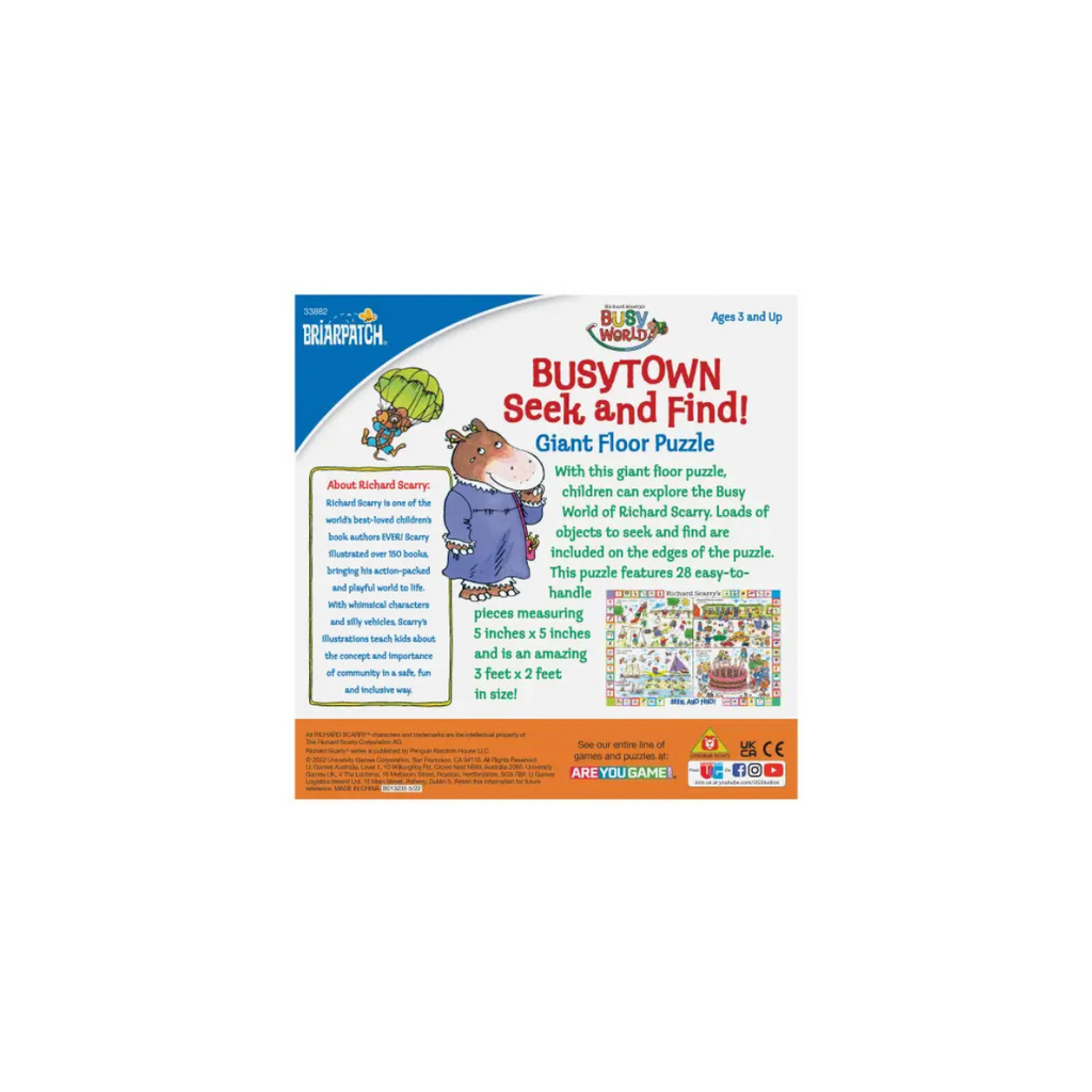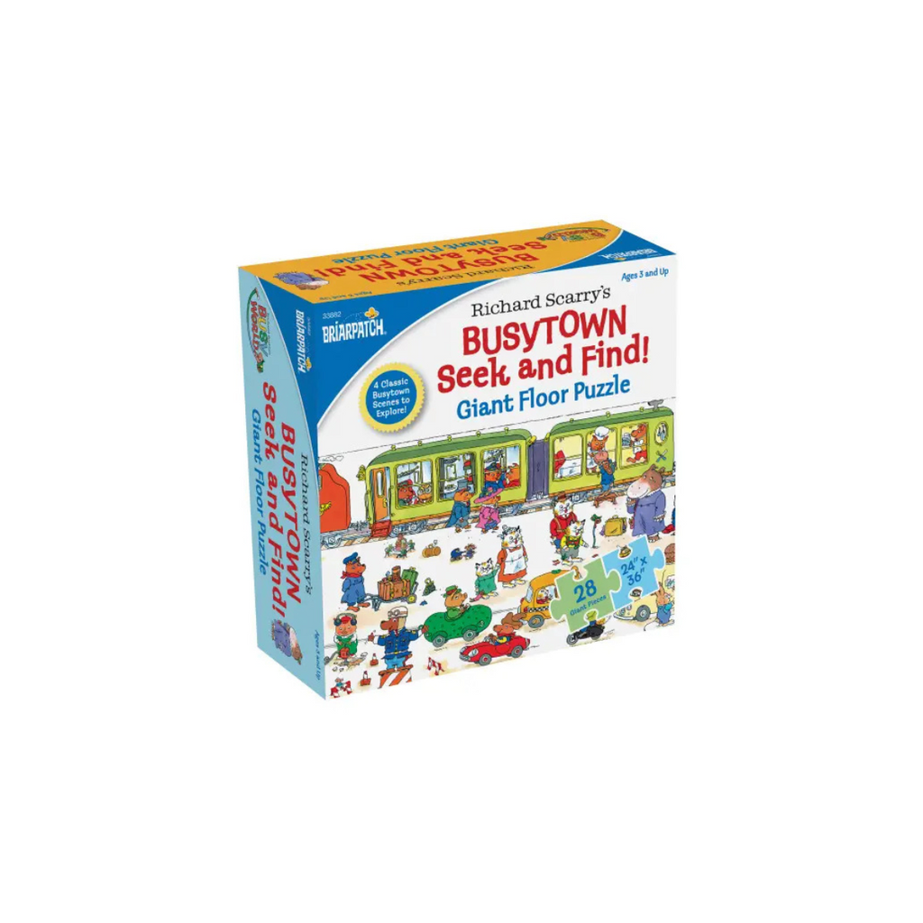 Richard Scarry Busytown Seek and Find! Giant Floor Puzzle. Huge 2 foot by 3 foot puzzles contains 4 different scenes to seek and find. Learn by finding hidden items from four classic scenes from Richard Scarry’s bestselling Busytown Books. With images from a day at the lake, a birthday party, a train station, and the park. Ages 3 and up. 28 easy-to-handle pieces make puzzling easy!