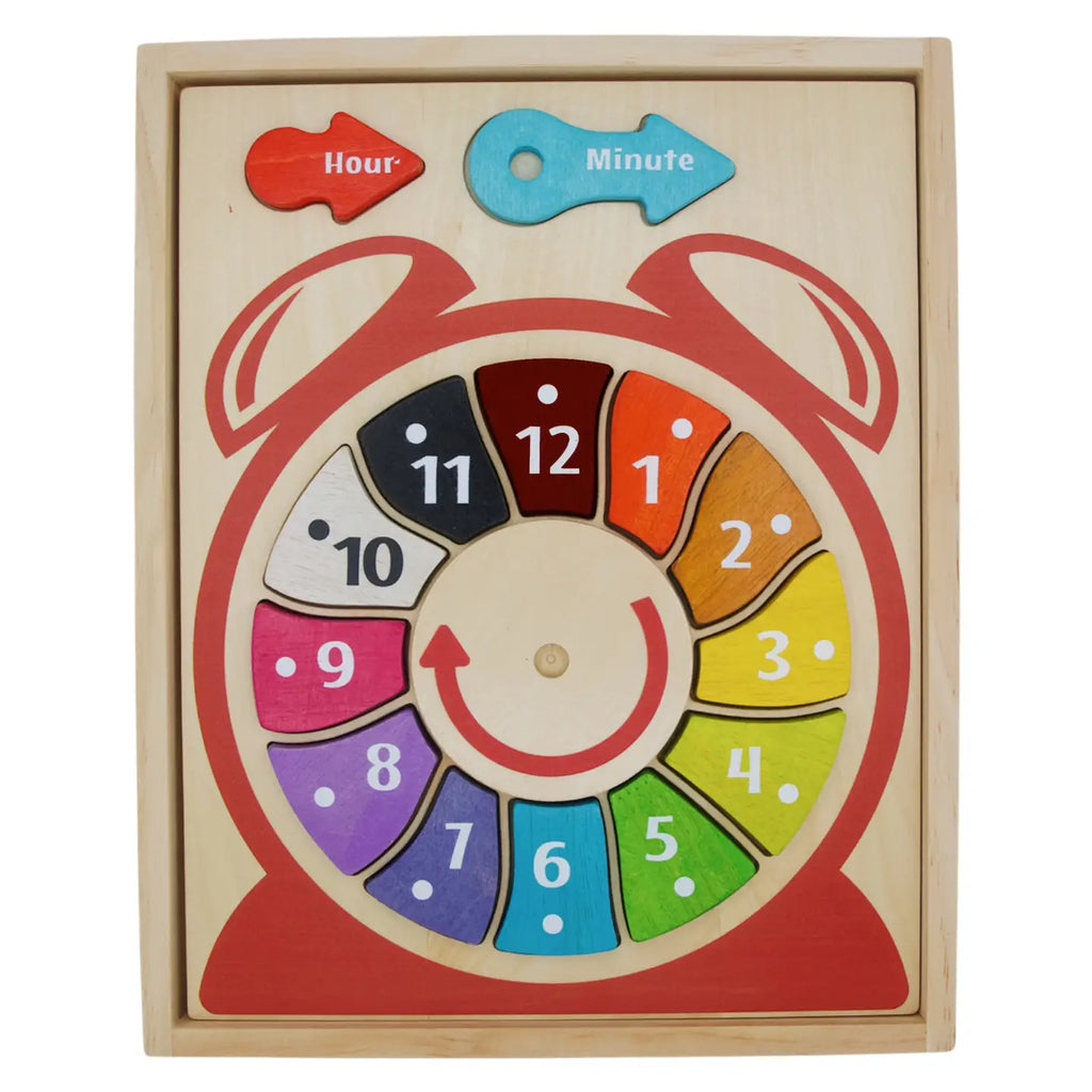 Play set includes the hour and minute hands, all 12 numbers, and the clock puzzle box. Kids can learn to identify numbers, count in English and Spanish, and learn to tell time with this eco-friendly puzzle.