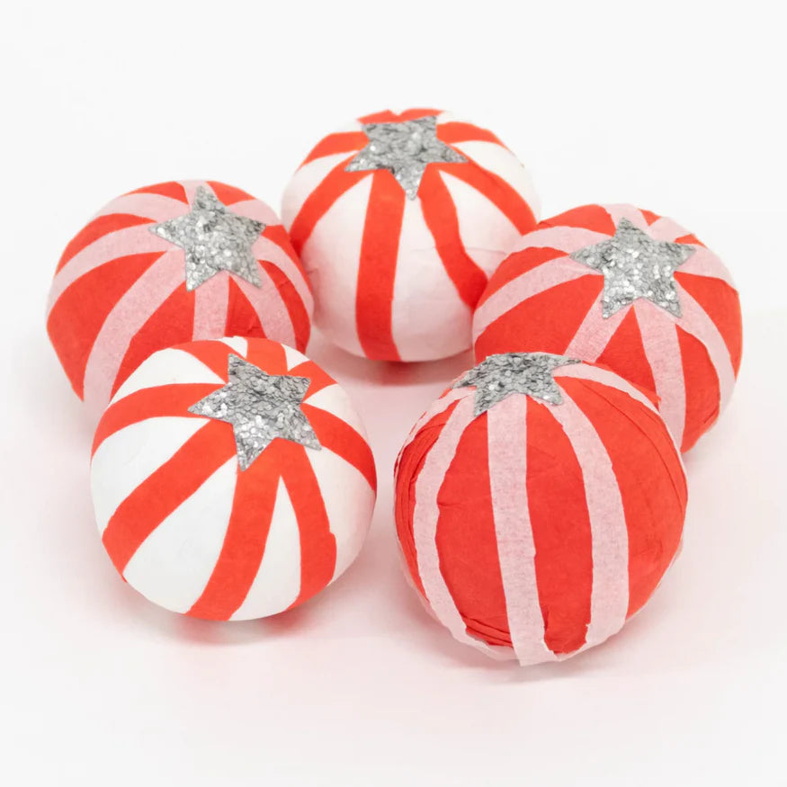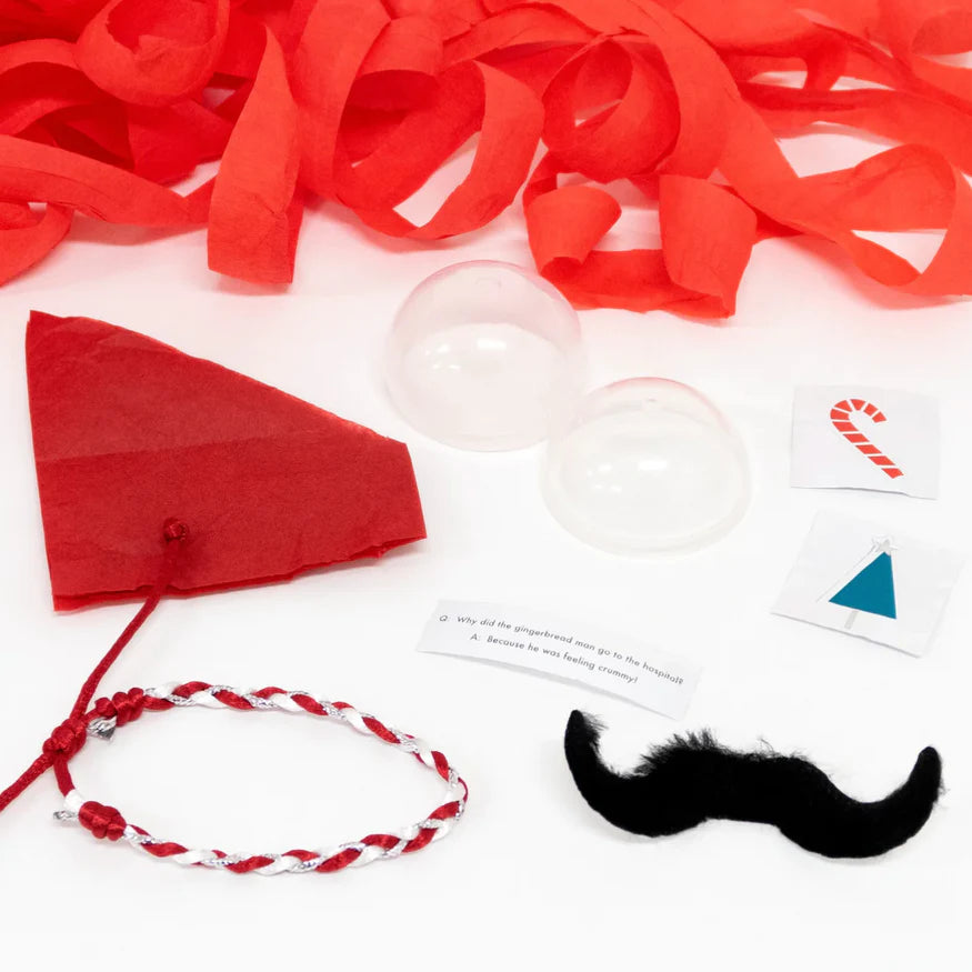 If you want to give your family and friends a fun surprise treat, then pop these fabulous balls at your place settings. They are crafted with traditional red and silver festive colors, and unwrap to reveal a paper hat, joke, self-adhesive mustache, 2 stickers, and a friendship bracelet. They are excellent to use as stocking fillers or as party bag treats too.
