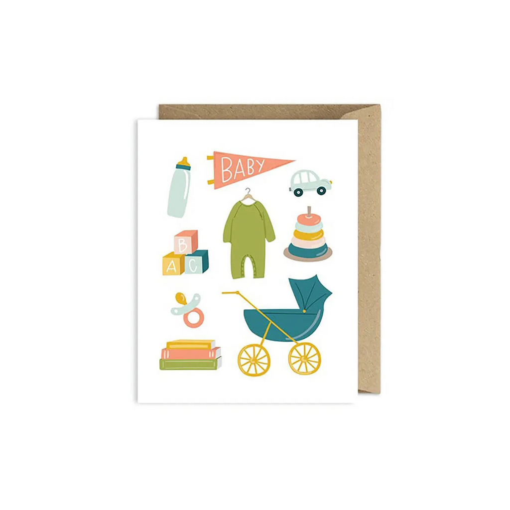 Introducing our cute and fun Baby Illustrations Greeting Card! The perfect card for your bff's baby shower or to pair with a gift for a new baby or their mama. This card features baby-related illustrations like a pram, a rattle, baby clothes, etc. adorn the front of the card.